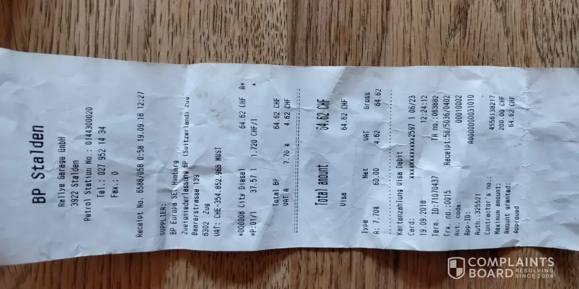 We had filled diesel at BP gas station (BP Stalden, Rallye Garage GmbH, 3922 Stalden- petrol station number [protected]) on 19.9.18 for CHF 64.62 but my credit card was debited for CHF. Attaching the receipt for your reference. When we spoke to the gas station, they said that our card will be credited back with the balance amount in maximum 2 days. It has been 6 days and we have not received the money back. We are here on a holiday and this debit is causing undue problems as our money is blocked. Please release at the earliest. Receipt attached for your reference.