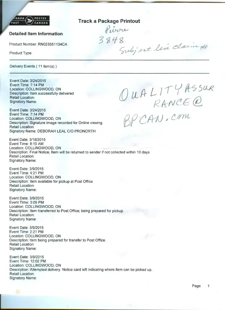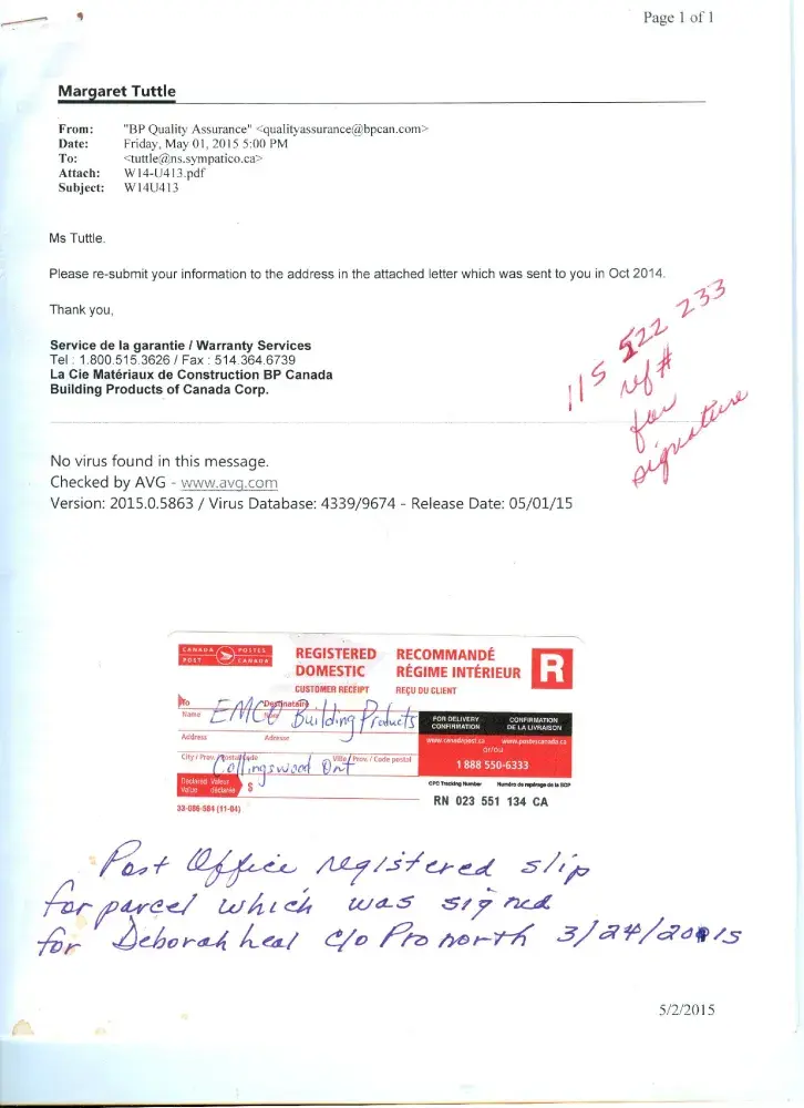 Much the grit was gone off my shingles plus curling and a number or exposed areas with only shingle backing showing on my ninth year of installing. I sent all the required photos and documentation by registered mail. After 3 months of no response I contacted them and they claim not to have received it. I sent them the claim slip from Canada Post with the tracking to them and their signing for the parcel. They then insisted I send it again and I emailed all the photos and scanned papers. I waited another 3 months and they claim they did not receive that either. I paid Canada post for a copy of the receiver's signature. Meanwhile I had my roof replaced due to leaking from the damaged shingles and they insist I have to send it all again but meanwhile I have lost my photos from my computer and feel I should not have to hire someone to go on the roof again to measure angles etc and crawl up in my attic to photograph vent. Please help.
