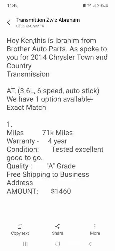 I brought a engine and a transmission the transmission was wrong and I had to pay 291.65 to ship back I have called and talked to kevin jason jeff but all I get is the run around they owe me 1140.00 back for transmission that they have got back I would never recomend thease peopletheir phone number 18889088835picked up 110422 deliverd on110722 at10.34am