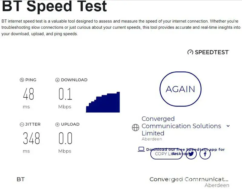 Customer resolutions then said they could do no more and were sending a deadlock letter, (never arrived) and they closed the complaint and refused to reply to me. New BT CEO was mailed but no reply. Openreach was a lot better. Then I lost the internet all together, after a new fault report an engineer Stuart attended who was great traced to fault to the cables on the poles (or should I say laying on the ground) and said he would get them fixed. He got my internet back on, even then resolutions refused to communicate or reply, so now awaiting the repairs to be done to the poles and cables. I took some photos of my speed test and telephone cables up the road, this is 2024. Is this the best we can get from the "leading" communications business in the UK?