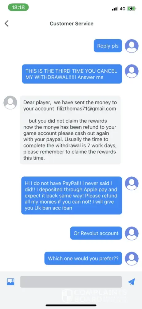 They cancelled my withdrawals 3 times. And said they sent it to PayPal but I do not have a PayPal acc. So replied: