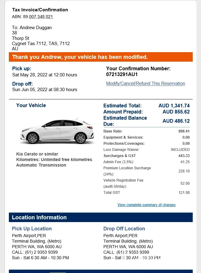 I pre-booked a car from Budget on April the 7th 2022 for pickup on the 27th May 2022 at Perth Airport.