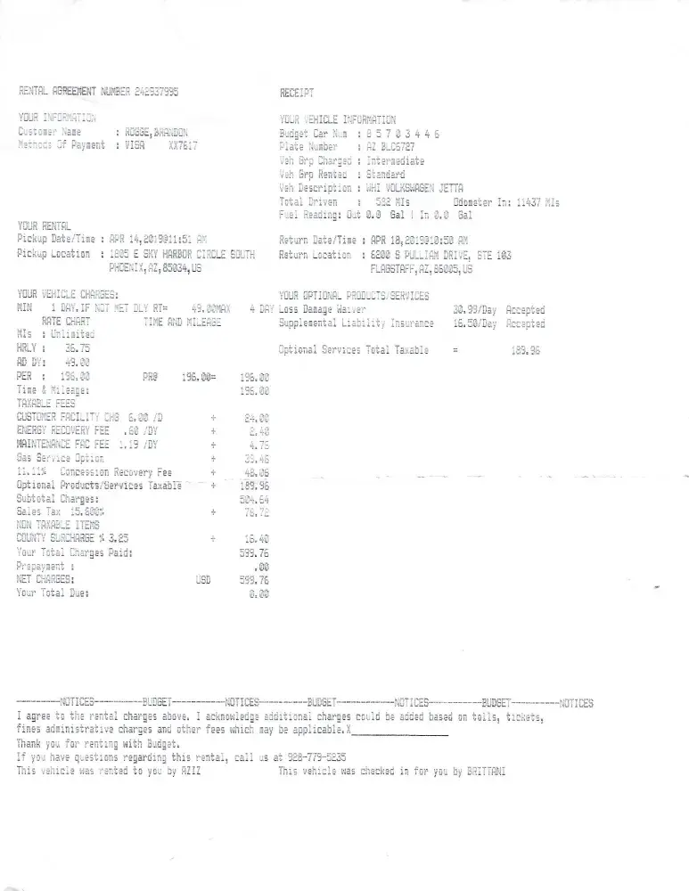 The date of this incident was April 14, 2019, with drop off on April 18, 2019 at the Flagstaff location. The rental agreement number on my receipt from the 14th is [protected]. I have attached receipts for this transaction to this email. You can contact me at [protected]@outlook.com or [protected]. Thank you