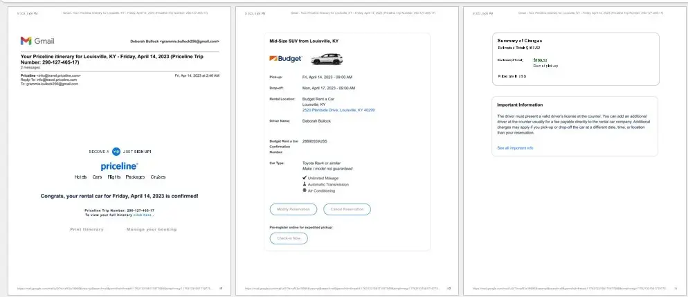 On April 14, I rented a Mid SUV from Budget on Crittenden Drive location, which is NOT the airport location. I reserved a rental through the Priceline Website Reservation number # [protected] for Friday, April 14, 2023 – Monday, April 17, 2023, Budget Rental Car # 28890559US5 With the charges of $160.52 due at pick up with the total cost of $199.52.