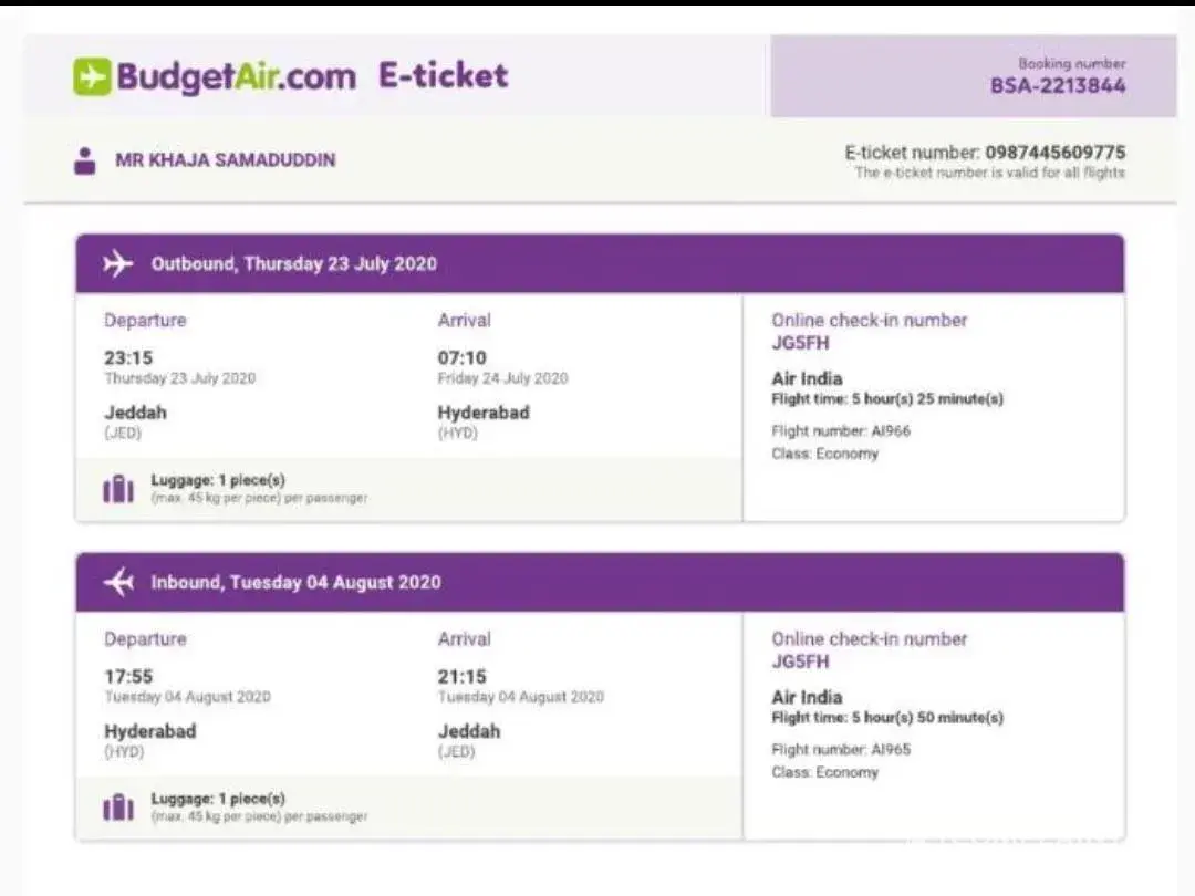 I booked tickets for my son's friends who wanted to visit India with him in July 2022. The booking was made and correct information was provided. I paid a sum of AUD 4836. These tickets were for Jordan Finn Stewart and Aiden Luke Tester Booking reference no BAU 3710863