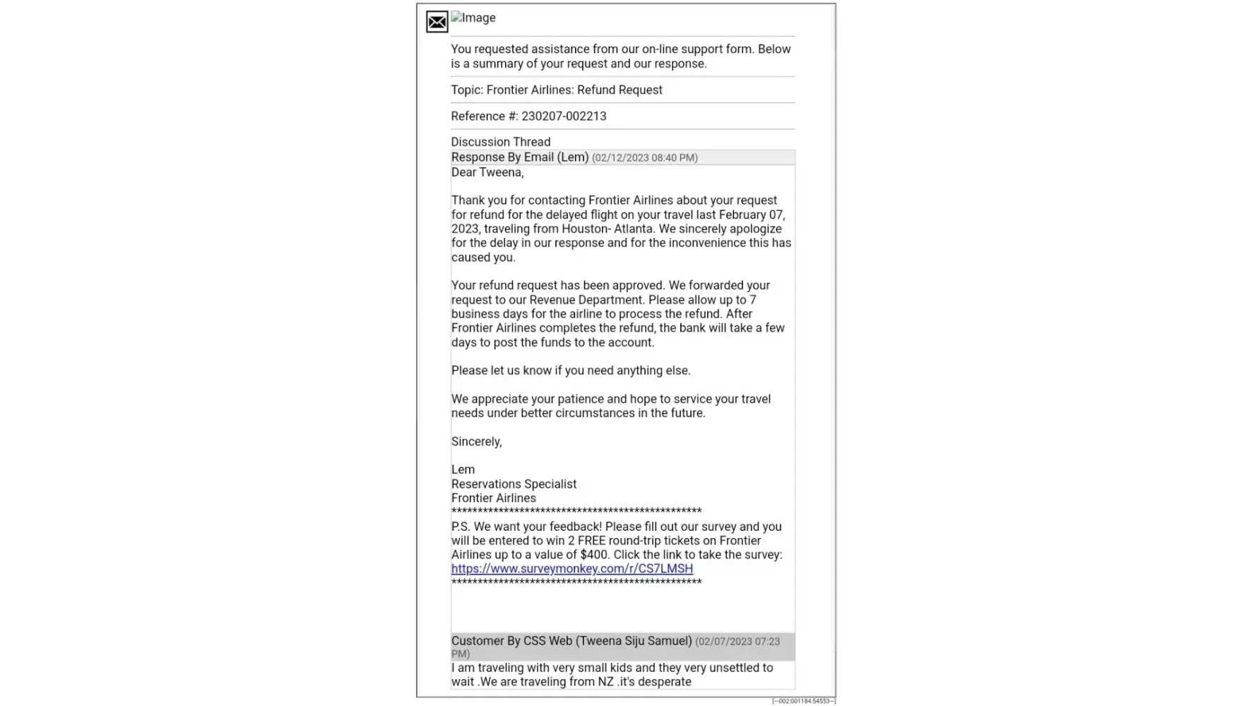 I already email you guys about my refund. last month on 7th of feb i suppose to fly houston to atlanta and atlanta to houston. But i cancelled my flight b'coz of delay and i spoke to frontier airlines and they agree to refund full amount, and they already transfer to your account. Now they saying they need to email to frontier airline I spend NZ dollar. I just visit USA from New Zealand and this happen to me and now Iam fed up to talking to everyone pls do needful asap.