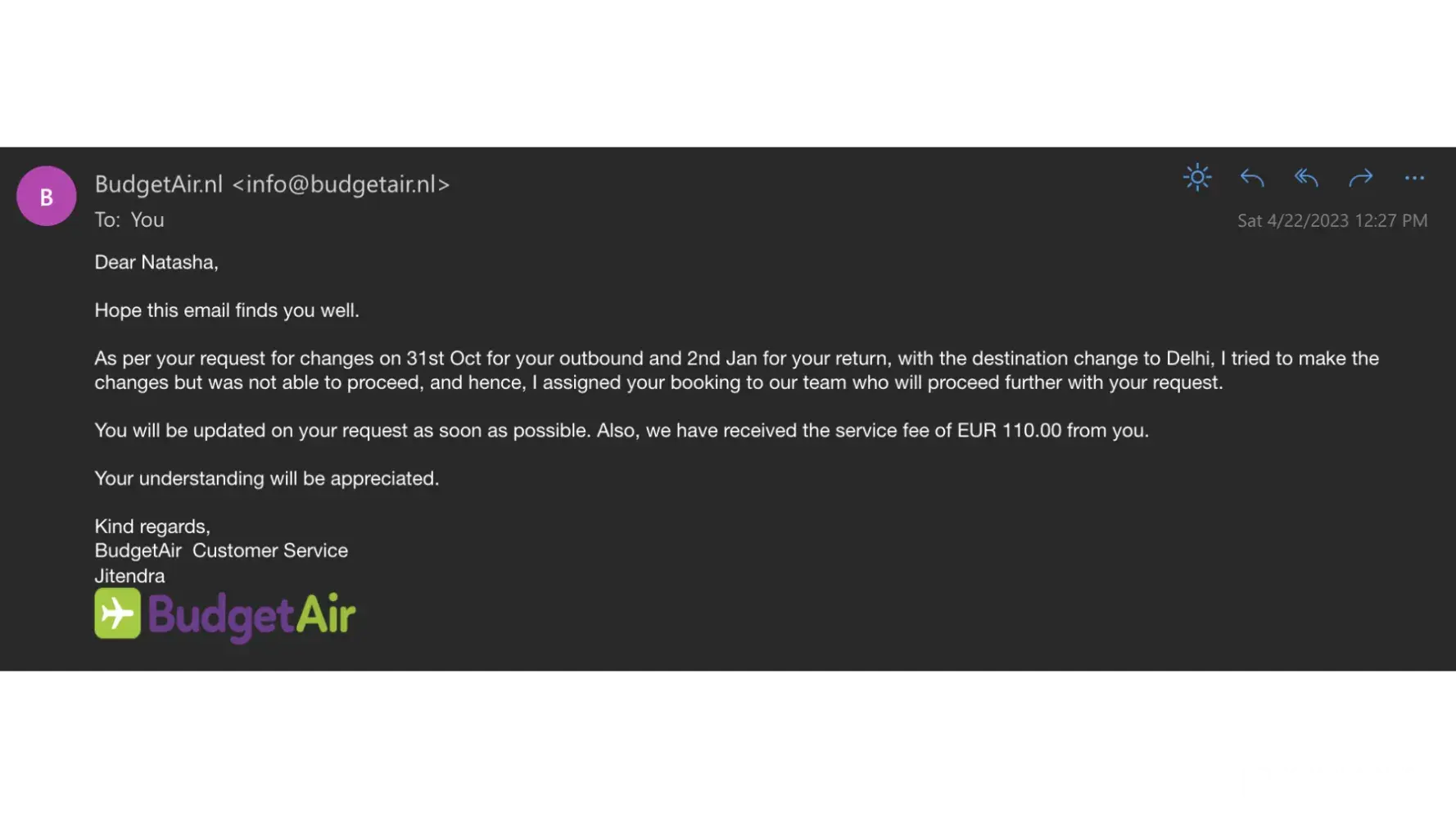 In the end, the financial loss I incurred and the mental toll taken during this ordeal were significant. I had hoped for a more understanding and empathetic approach from BudgetAir, considering the impact their mishandling had on my travel plans and overall experience.