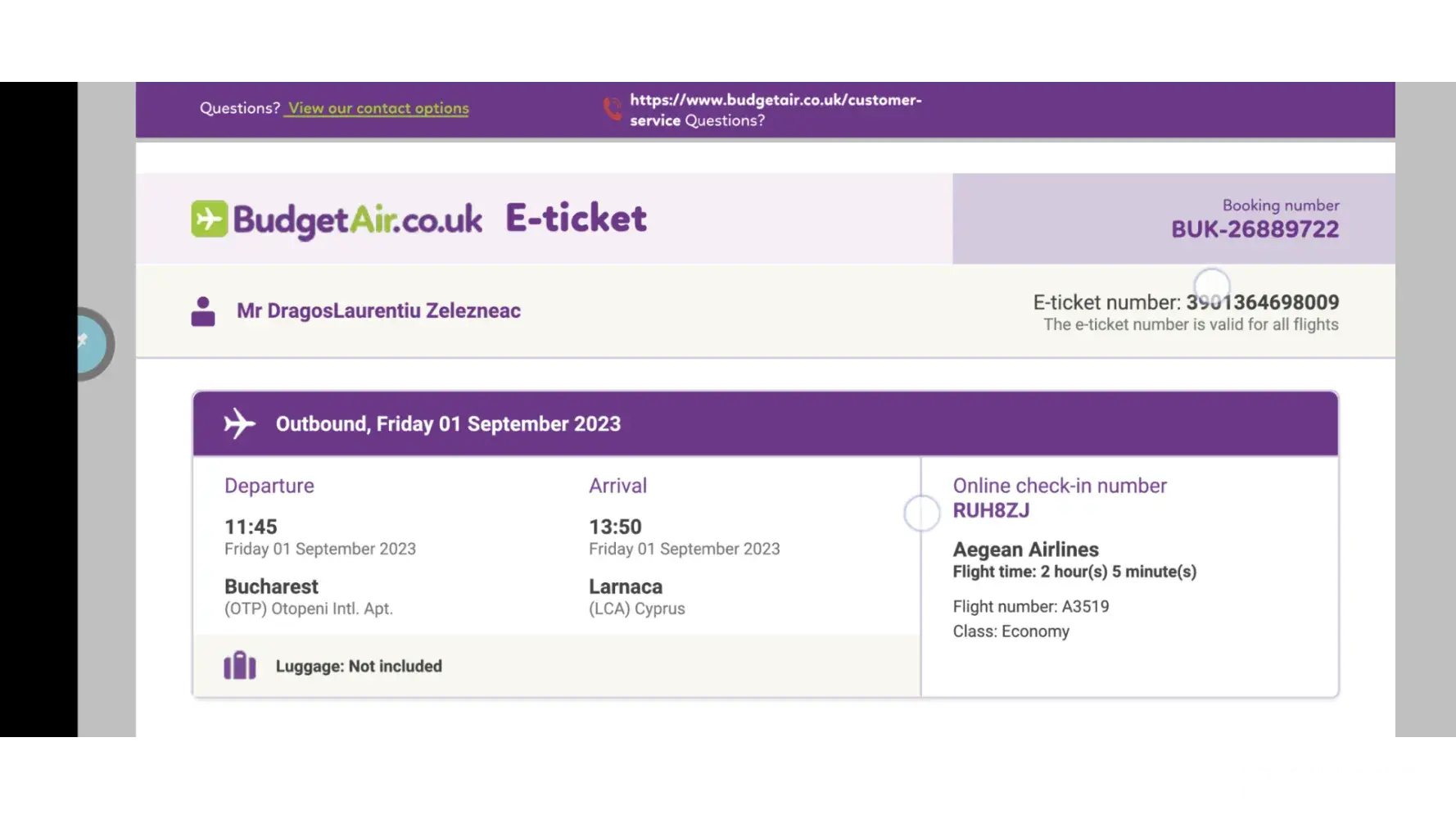 Skyscanner redirected us to BudgetAir.co.uk to complete tickets purchase for 01 Sep OTP-LCA flight - A3519 (Aegean). Bought 3 tickets on 27 Feb.