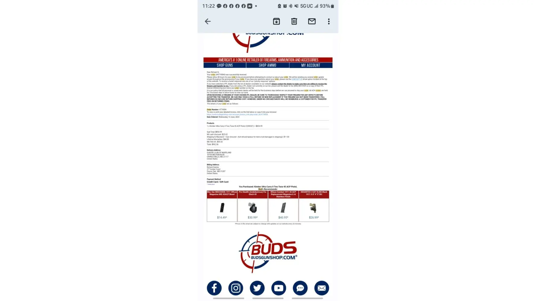 We found clear and detailed contact information for BudsGunShop.com. The company provides a physical address, 5 phone numbers, and 2 emails, as well as 5 social media accounts. This demonstrates a commitment to customer service and transparency, which is a positive sign for building trust with customers.