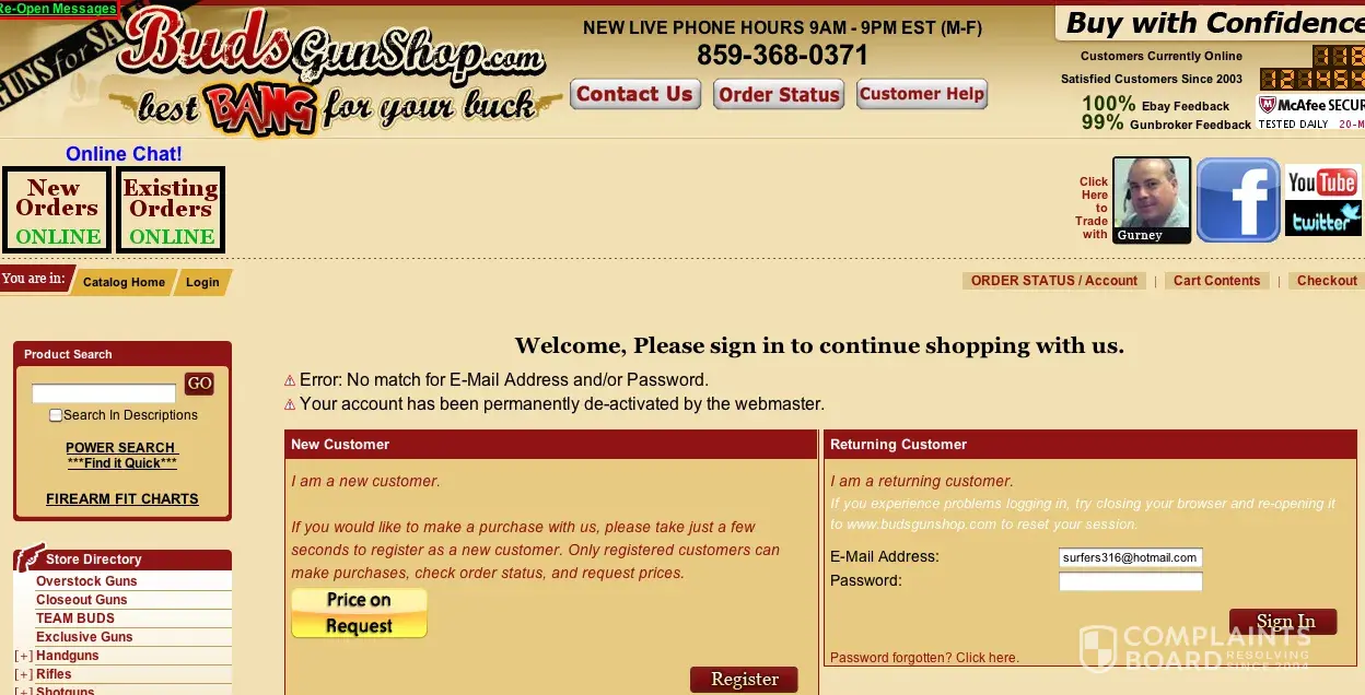 I placed an order for a gun on their website, and a few days later wanted to change the other. I was charged a 10% restocking fee to make the changes to which I had no choice but agree or forfeit my money. After the purchase, I submitted a negative customer review and cited the incident mentioned above. I then received an email from a person called Nick Valle who is supposedly a Customer Service Manager informing me to call him to discuss my recent review. I called and explained to him why I posted the negative review to which we replied as unfair to their business. After the call I sent him an email further detailing the reasons why a negative review was submitted. In return, I receive an email stating that my current order that was pending had been cancelled. A few minutes later I attempt to log onto the website and to my surprise I am brought to a screen telling me that my account cannot be found and that it has been permanently suspended. WOW! Talk about taking care of your customers! Buds Gun Shop will never see a penny from me, and I warn against everyone else thinking about giving them your hard earned money.