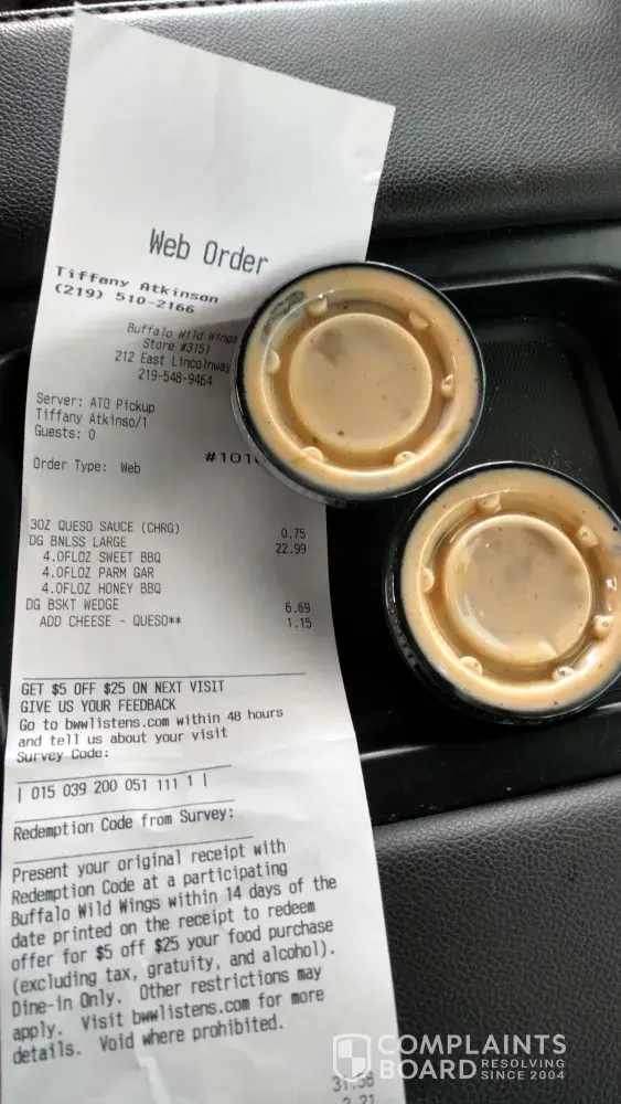 I ordered half buffalo mild half garlic plus others they sent two buffalo I ordered over 70 of to go food everything else was correct but the basics I also was in trying to get my son a ball out of vending machine it jammed and told me no one could help customer service was completely useless I had to ask her to refund although she should have offererred I get busy but service is the area she is in