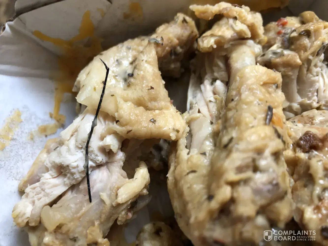 On march 9 at approximately 11:30 pm, after work, I ordered a 6 piece parmesan garlic traditional wings, and a small potato wedge with cheese and sour cream. I usually get my wings well done and all flappers, however I was tired from working 12 hours and I was extremely famished, I did not. The drum sticks are hard to consume, but as I was eating them I noticed an black object in it. I picked it up and looked at it, trying to figure out how it was so close to food, & how it was dropped in my food! I wrapped it up w/ the receipt and threw it in my fridge ready to return