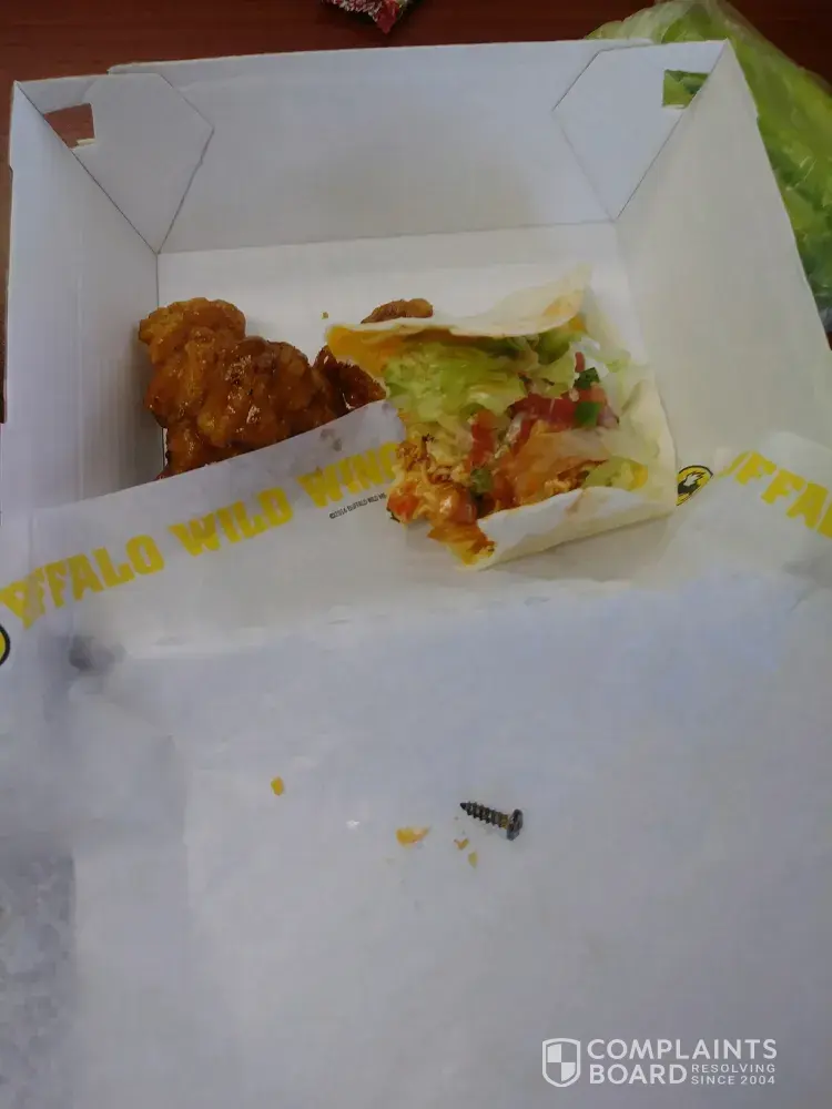 On October 22, 2018, my office did BWW take out from the Woodridge, IL location. I went to take a bite out of my Chicken Buffalitos and bit a screw! I, and a few of my co-workers, took pictures - and I obviously called to complain about it to the location. The manager, Nick, said he would remove the Buffalitos from the lunch order. I am sickened by this event and will be writing my review wherever possible. Buffalo Wild Wings is lucky I wasn't injured or I would be contacting my lawyer first.