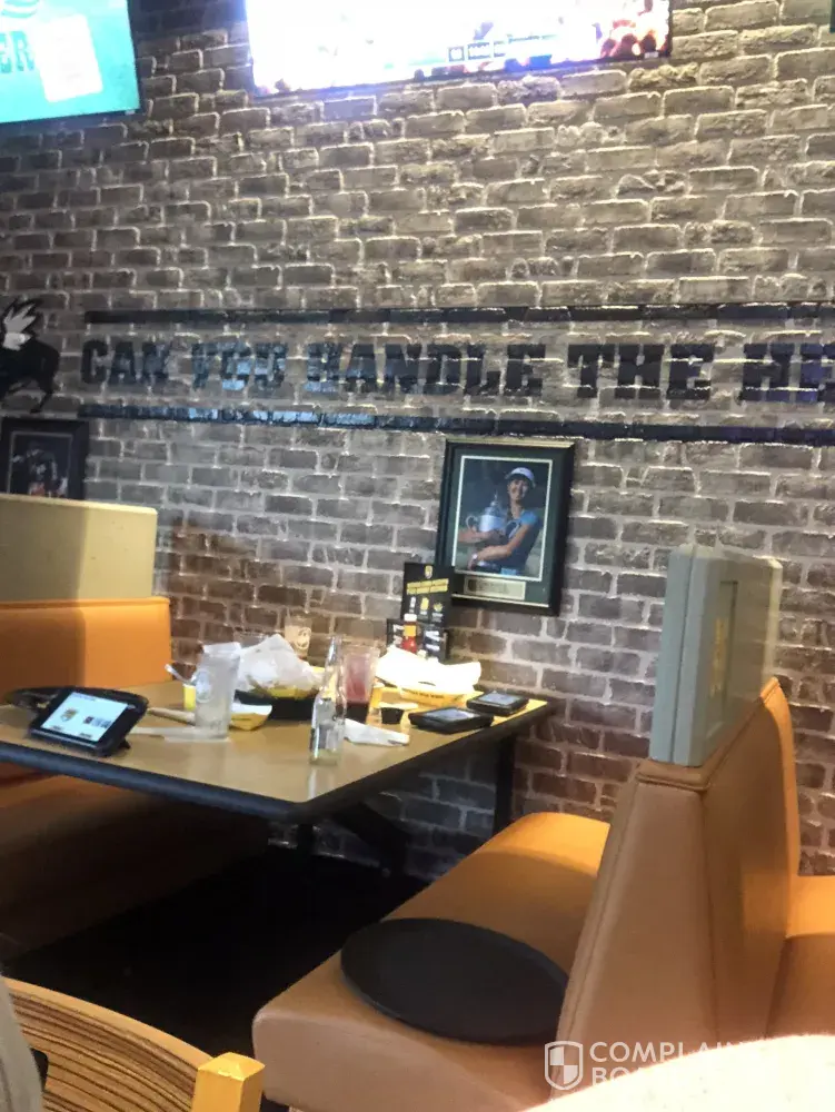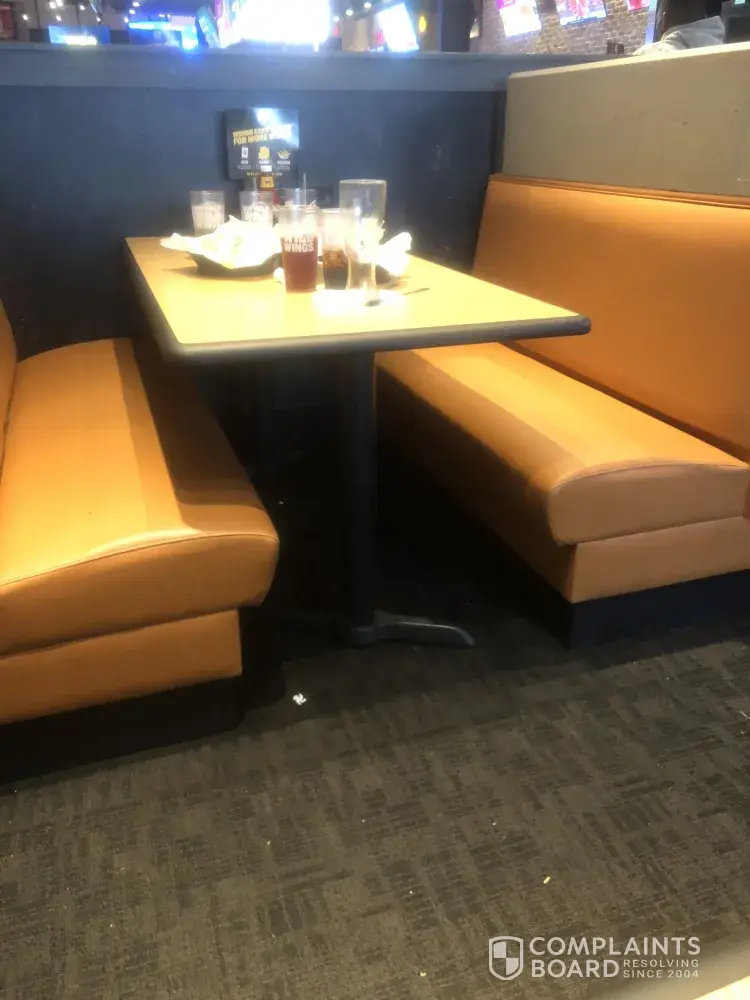 On this day of April 27, 2018 my wife and I went to this Buffalo Wild Wings. We first walked into this building and saw a group of workers standing in the front area talking and what not, a young lady asked us if we preferred a table, booth or open seating. To which I responded and said "i'd like a table" so then she walked off and we never saw her again. Then a man walked up to us and asked the same exact question, and I said the same exact thing " a table please" then we waited for a good 10 minutes before getting seated, now take note this isn't a very busy time we went. There was a few people here and there but no where near busy what so ever. The table we were seated at was gross there was food all over it and the seats were wet they made very little effort to clean it for us. Then all the tables surrounding us were still dirty and had stuff on them. Anyways so we get seated and wait to be served and our server takes our drink order and disappears for about 10 minutes. We ordered water, then she took our food order we ordered a medium size of honey bbq and a large basket of fries to share. The food came out pretty fast but when we got it, all of it was cold the chicken was still very much frozen inside and the fries we cold and seemed to be old ones from earlier on that day. I must say that the staff there is very unprofessional and needs help.