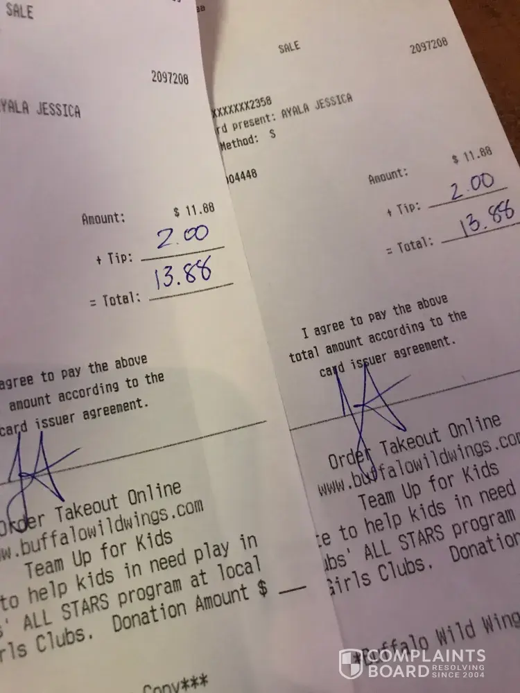 Okay so my friends and I went out to eat at Buffalo Wild Wings and after we finished eating my total came to about $8 and I had a $20 bill, and so after we gave the server our money and he came back I gave him a $2 tip and then when I come I realize that they gave $5 less because I did the math and everything and I was like okay I gave them 10 dollars I should've received 10 dollars back but no I received 5 dollars back.
