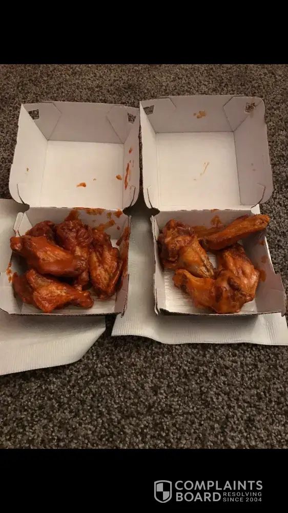I ordered 2 separate small sized traditional wings to go. One order I had contained half medium and half hot and when I got home to open the boxes I came upon noticing I only had 4 medium wings and 5 hot, meaning I was missing one wing. The picture attached shows the right side including only 4 wings. It was a huge disappointment and an even greater inconvenience for me to find one missing wing once I got home.