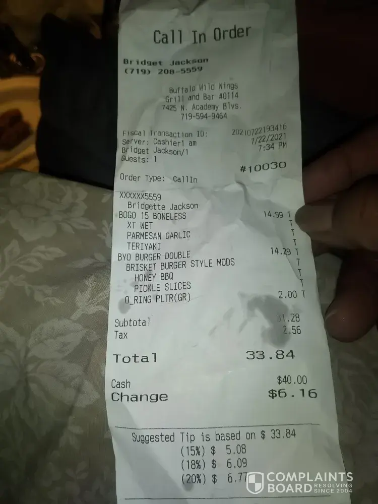 I've been eating at Buffalo Wild Wings in Illinois and Indiana for years and have Never been through something like this. I want a full refund for $77.47