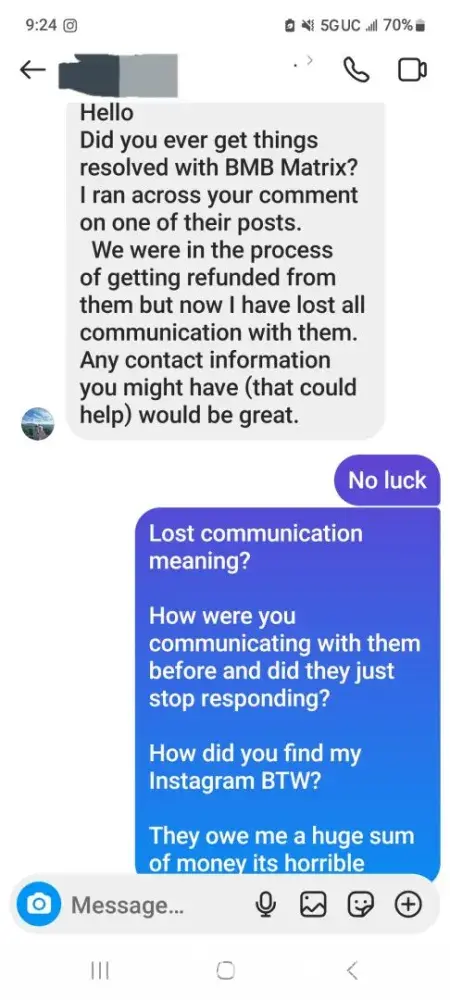 Exactly the same thing happened to me, word for word. I think we should try and get names of others who have experienced this scam and try to go after BMB Matrix with an attorney. I am checking on the possability that BMB Matrix uses out of country people to communicate within their Basecamp message system and possible do not operate their business out of the address they have listed in Philadelphia PA. I may send someone I know who lives in Philadelphia to the company address to see if they are even a US company, or a foreign based scam.