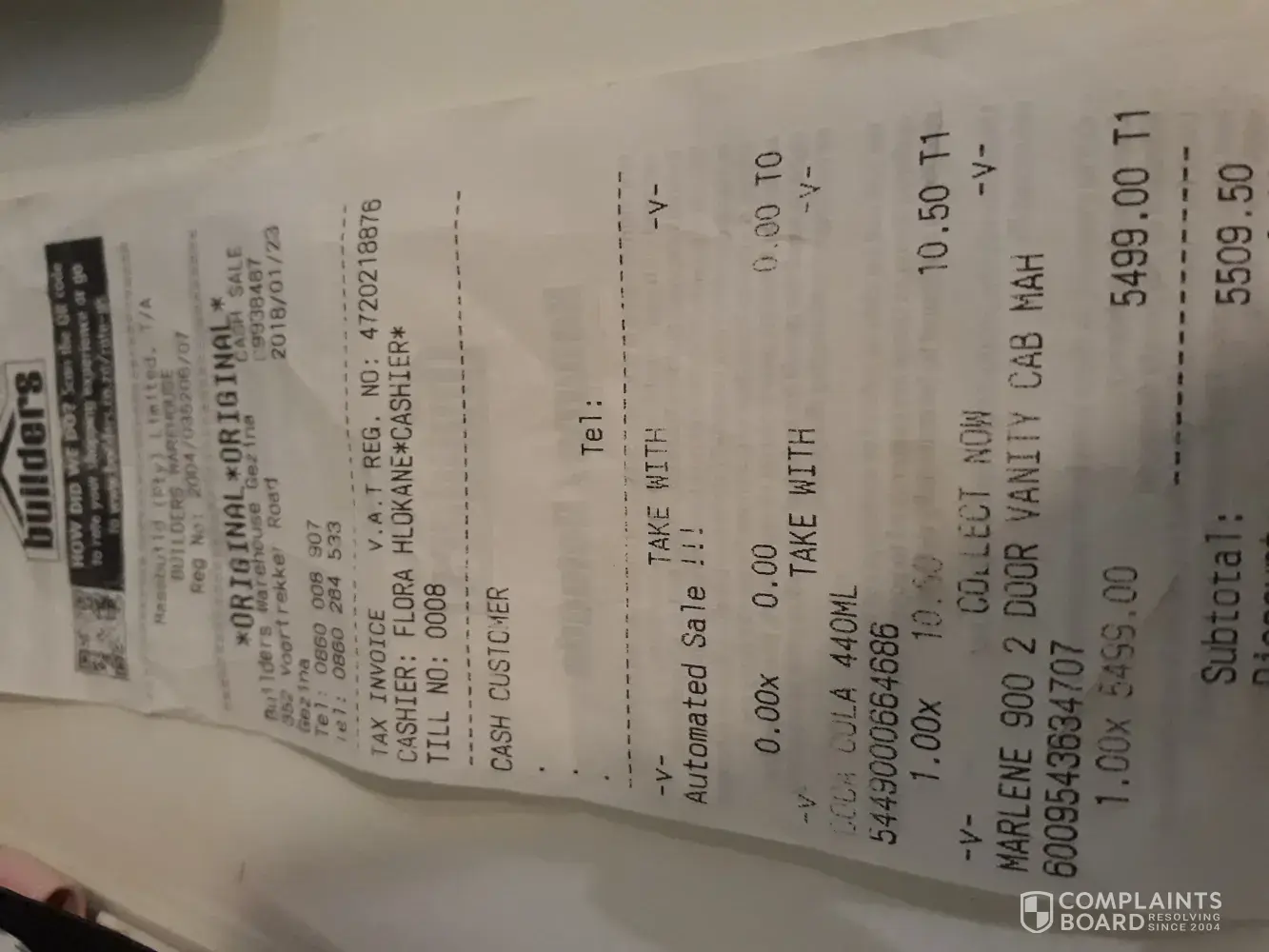 On January 23, 2018, I went to Builders Atterbury to purchase a "Marlene 900 2 door vanity Cabinet Mahogony [protected])" that was on display for R4300 (see attached photo)