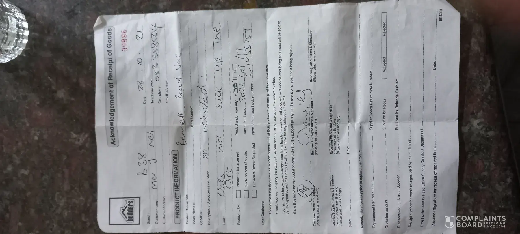 Vacuum stopped working and product was returned on 28th October 2021 to Builders Warehouse, George.