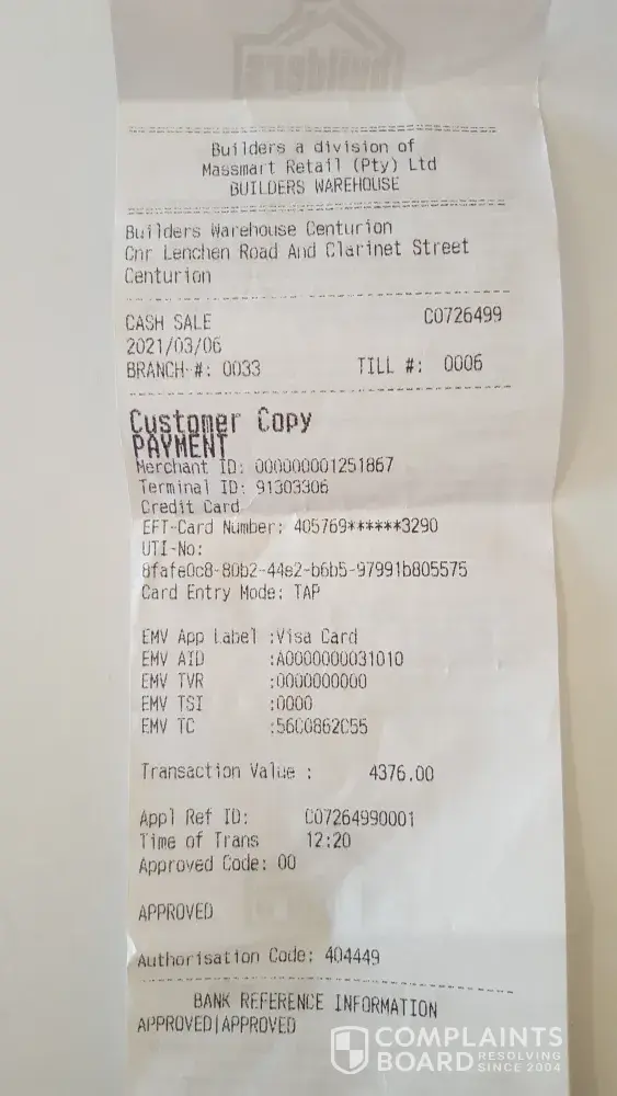 Please see mail send to [protected]@builders.co.za complaint ref no: [protected]