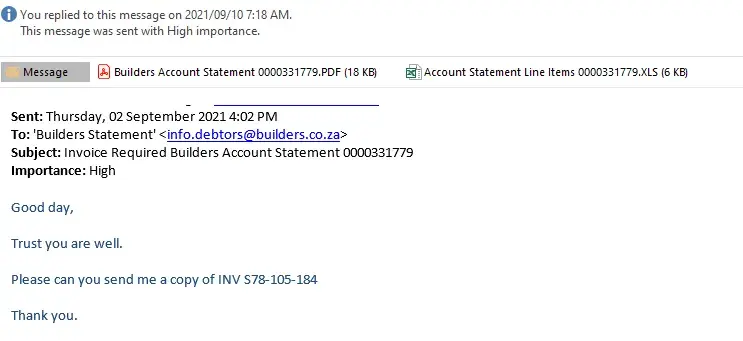 I sent an emails everyday from Friday 02 September up until today 10 September 2021 requesting a copy of an invoice for the debtors department with no response.