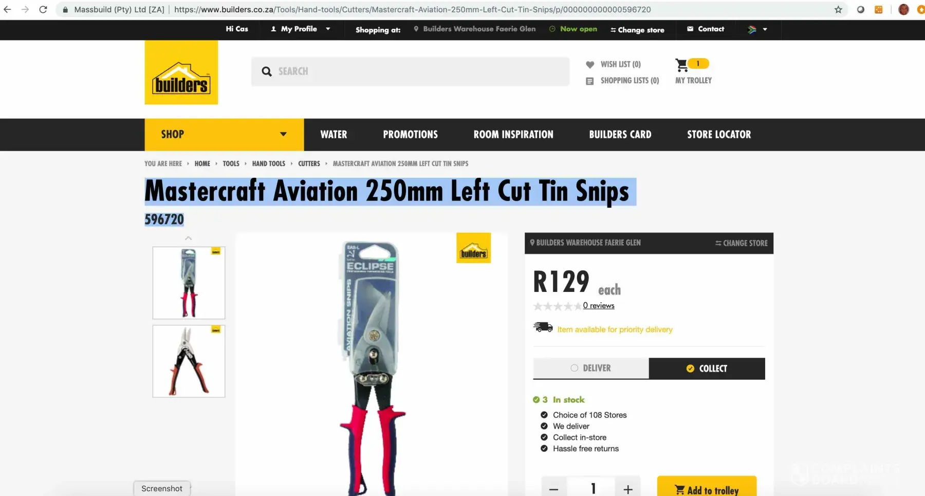 I checked stock of Mastercraft Aviation 250mm Left Cut Tin Snips 596720 via the builders website only to find no stock on my arrival.