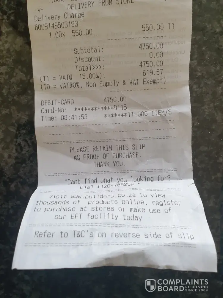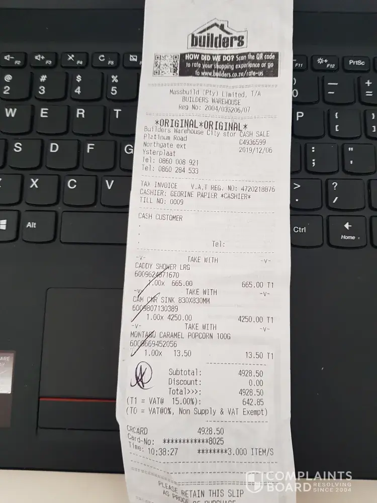 This is not the service that I am used to at builders warehouse.I attach a photo of the invoice as well as the rude male assistant at the sinks.