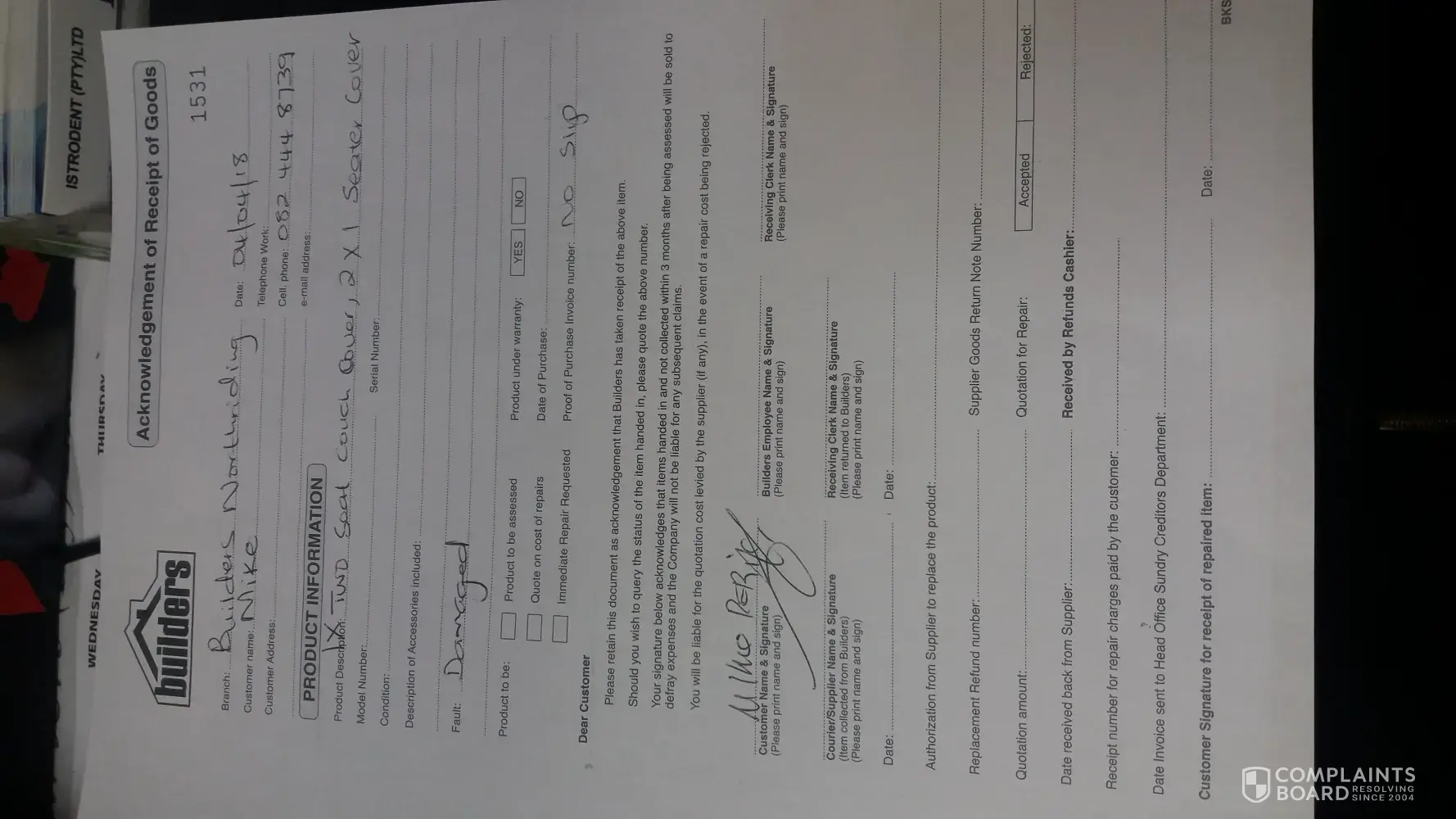 I am disappointed with the cupboards I bought from Builders Warehouse, Parklands on 14 October 2018. This is poor quality and does not belong inside the warehouse to be sell to customers its an indication of poor services. Goods and service that is on the floor should be of good quality as the customer pay for what they want and not the reject cupboards I received after I waisted fuel to get to the warehouse, did a cash sale only to get home and discovered the following: