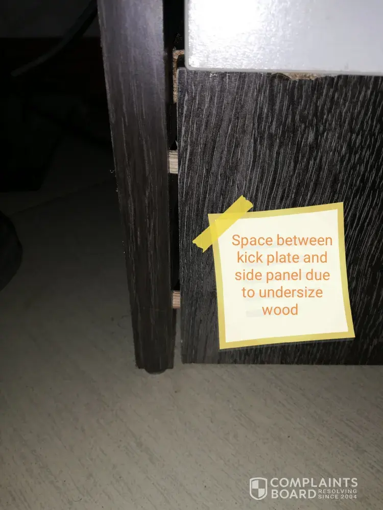 >Gaps still present between side panel, kick plate and fascia due to variable lengths and undersized wood from packaging that does not correspond with the assembly instruction guide provided.