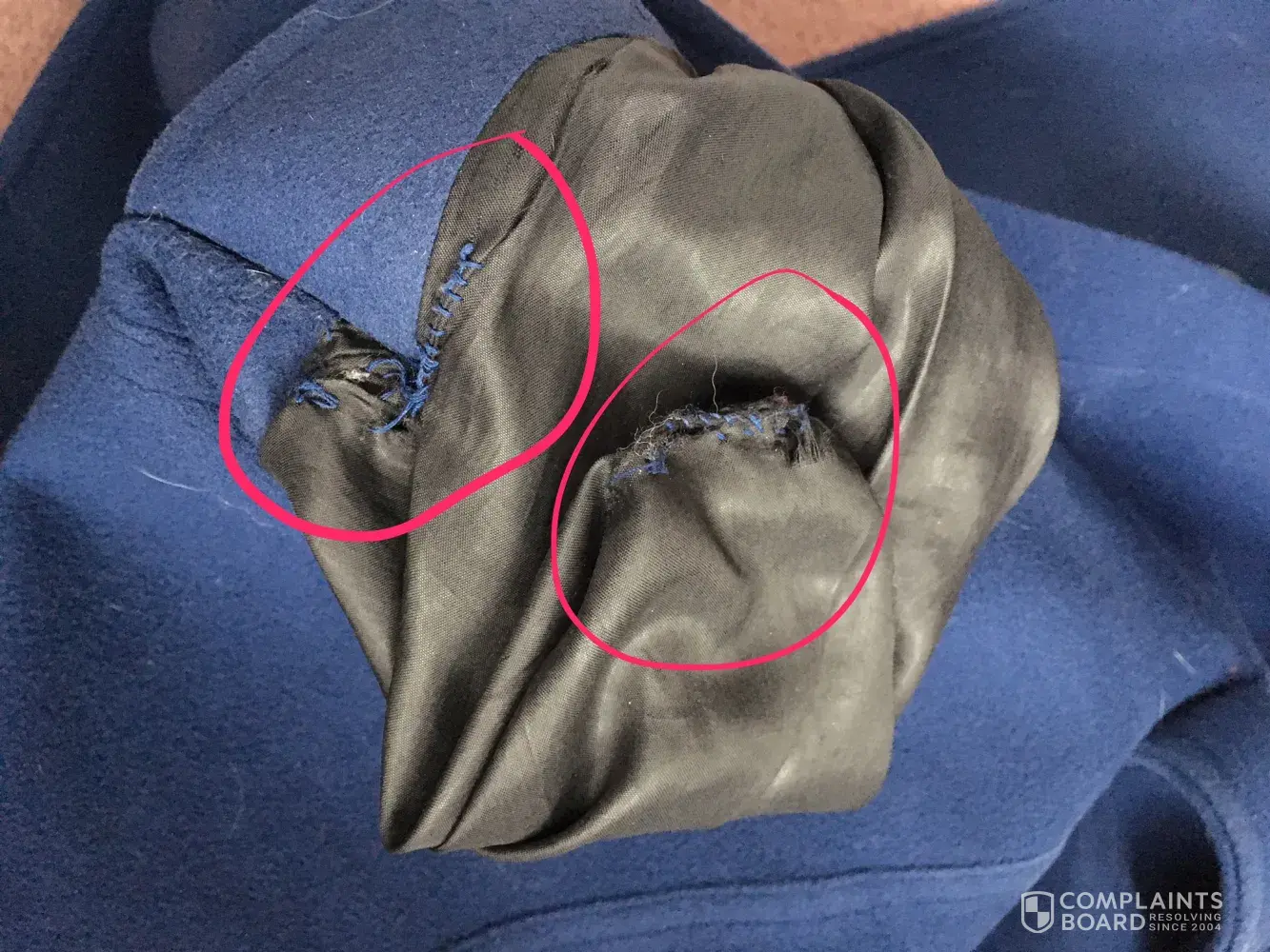 On top of all of that the outer coat split in the shoulder as well. I contacted the head office straight away and they asked me to bring it to their flagship store to take a look at it. They kept the coat for almost 2 weeks before calling us and telling me it was normal "Wear and Tear" and a new lining would be $250. I went back to the head office and asked them to cover the repair considering the damage and how long I've had it ect.