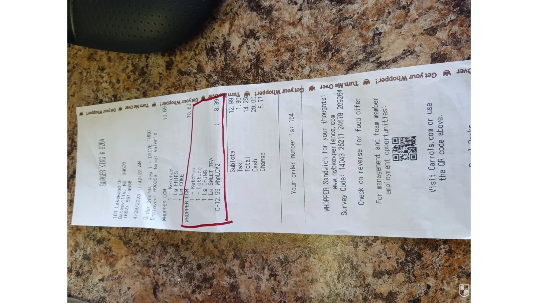 My husband ordered the coupon Whopper meal special and requested no lettuce on my sandwich and onion rings instead of fries and extra mayo and salt. I got a whopper with lettuce, no extra mayo, no salt but I got fries! The only reason I chose Burger King was the onion rings. I DETEST fries! I cannot eat lettuce because of a medical condition. After I removed my lettuce, I had a dry sandwich and fries that I had to throw away. My husband, who usually loves fries, threw his away because they were horrible. When you spend about $15.00 for burger combo meals, you expect to be able to eat them. I called the Burger King for about 20 minutes repeatedly and got no answer. Am I wrong, or shouldn't a business answer their phone? I demand restitution. Oh yeah, they did give me Zesty sauce...for the non-existent onion rings. I am attaching my receipt showing that they did have the onion rings on there.