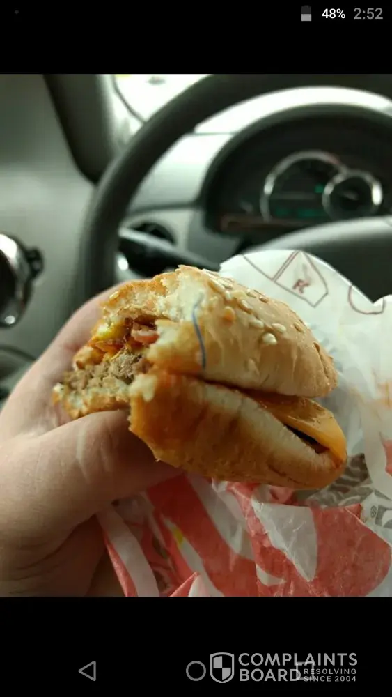 As I was eating my bacon cheeseburger I looked down to see a foreign object baked into the bun that I had almost eaten. It was blue and plastic-like substance kind of looks like a string or dental floss. I stopped in 458 Smithfield Ave. Providence Rhode Island to get lunch on my way to my next job site and when I stopped at the job site I began eating and found this. I could not continue eating this and realize it's a supplier of your company that did this and these employees here missed it.