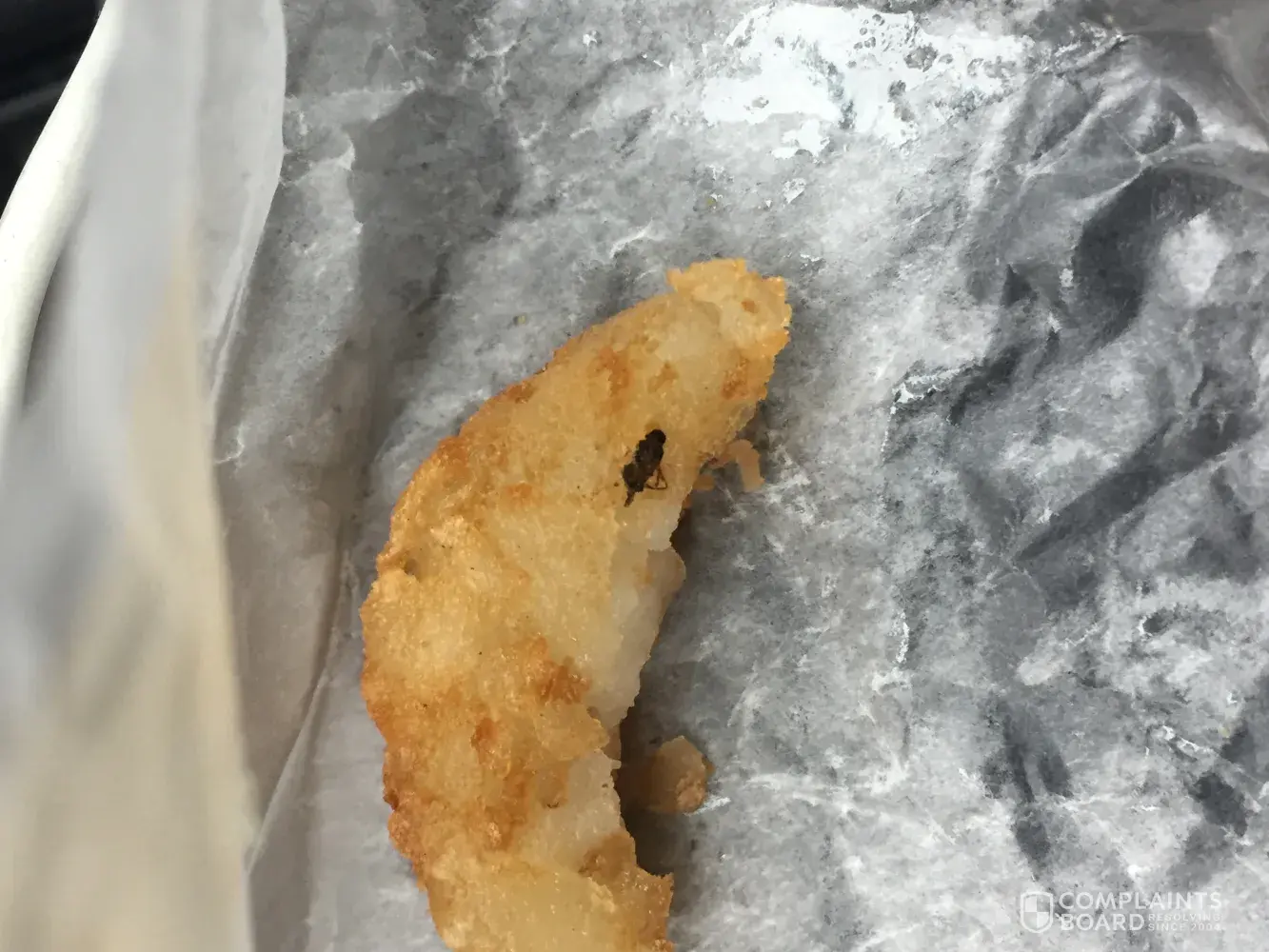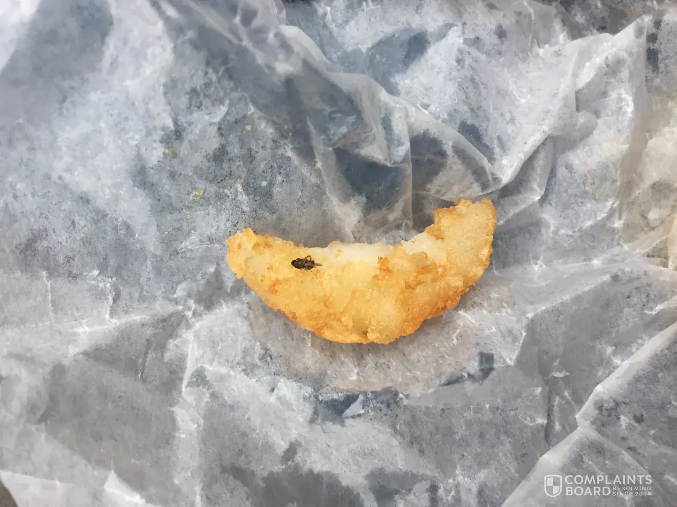 I ordered breakfast from the drive thru this morning and while driving to work my wife took a bite of one of the tater tots/hash brown pieces and she saw a small bug on it. Luckily she did not bite into it. She almost vomited and we both immediately stopped eating. We both felt nauseous. This was such a horrible experience that I will never give my business to Burger King again!