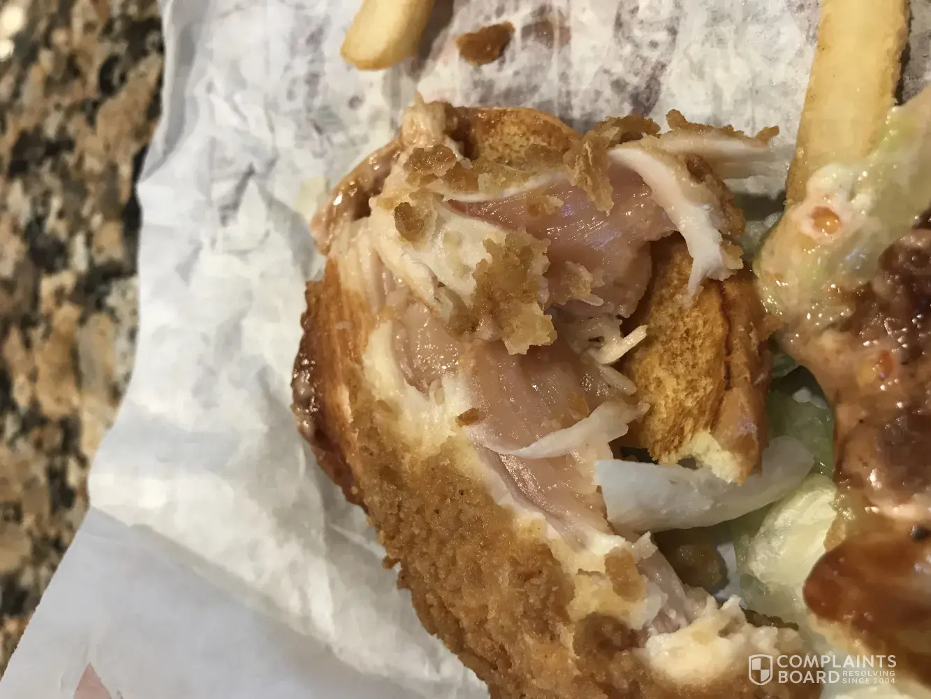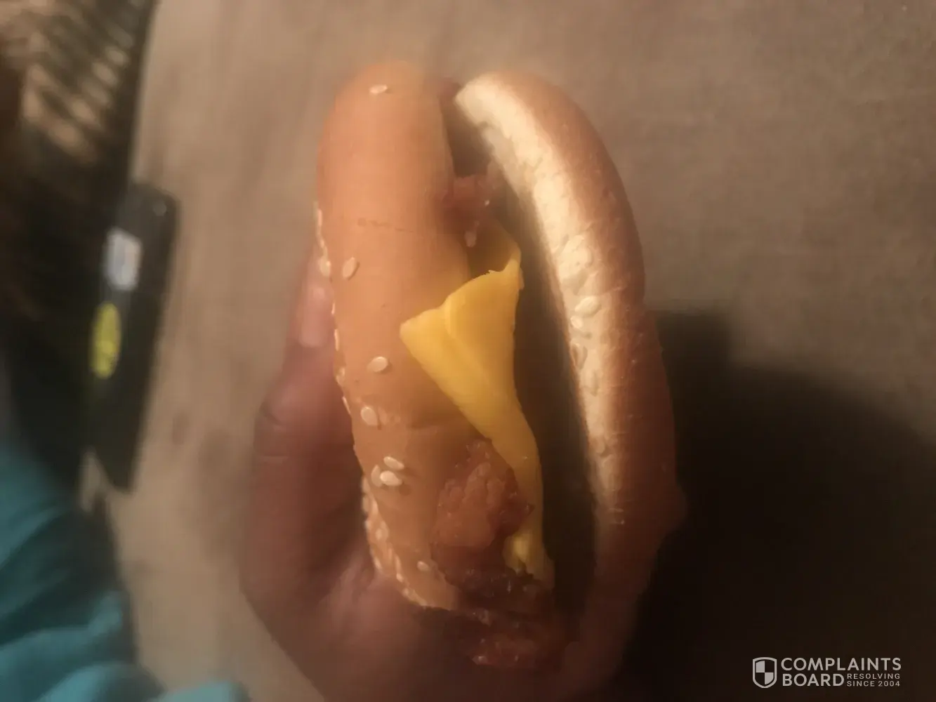 I came in at 2:19 pm on Saturday, May 12 and ordered the 2 for $6 (Whopper and Crispy Chicken). After waiting 20 minutes, I saw customers who came in after me received their orders. Asked the manager and she told me it takes 6 minutes for the Crispy Chicken and would have to wait and that new employees had to learn. I already waited 20 minutes. Received my meal in about 1/2 hr. Went home and opened the crispy chicken sandwich. It had the diameter of a quarter and so tiny. The cook in training did not give me a crispy chicken. Looked overcooked; gave to my dog. Then I opened the Whopper, my favorite burger in the world. When I took a bite, did not taste like a Whopper. Looked at the meat and it was old, burnt and cold. They only had one cook in training and one server with 1/ 2" nails. I work in health profession and food servers cannot have long nails due to OSHA regulations. In addition, she wore no gloves. At the end, I had to ask the manager for my receipt. No apologies. # on bottom of receipt is T-00L, I = 5, C=9538. I want a refund and will never again purchase your food if this is the kind of people you hire.