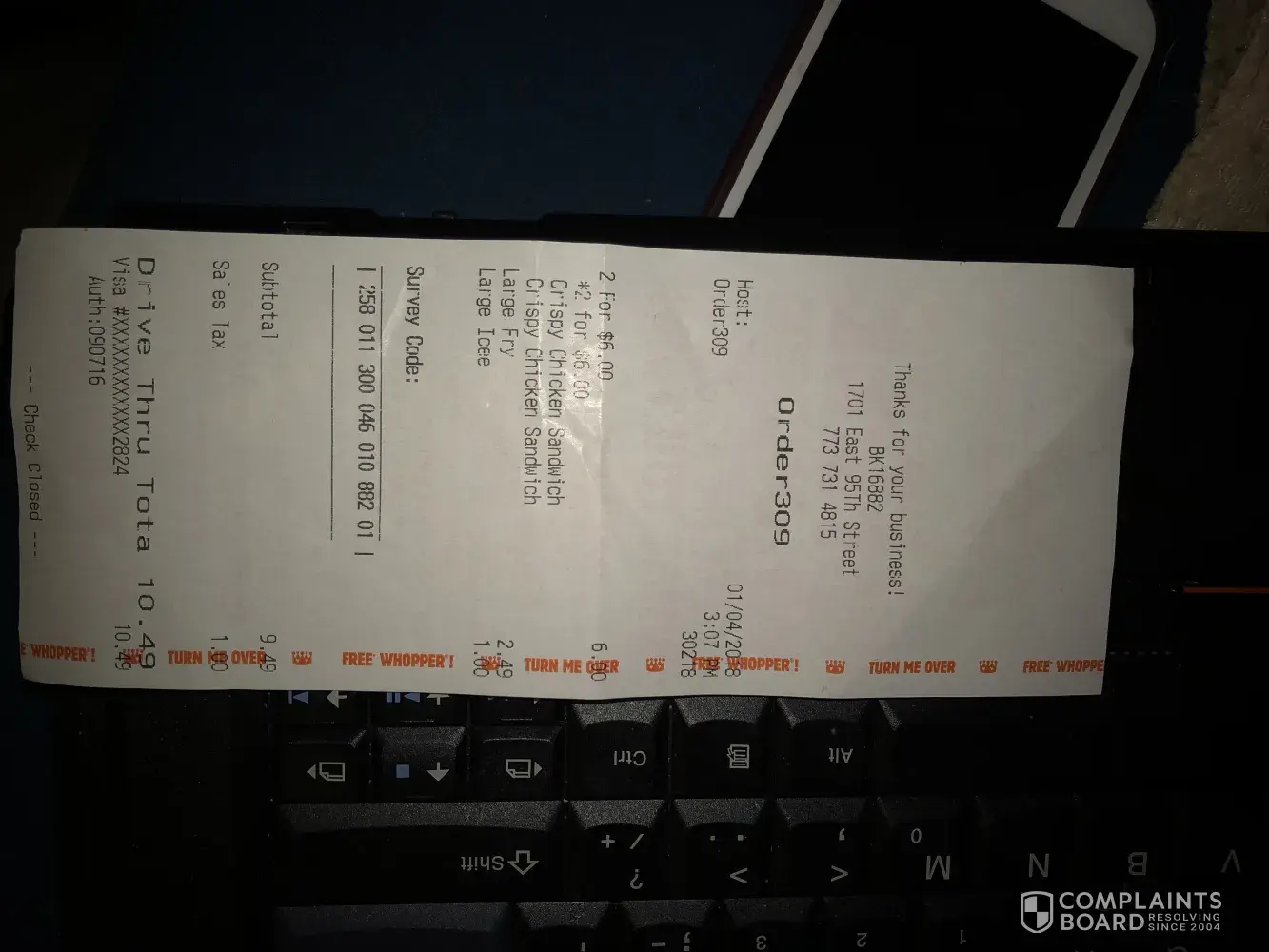 January 10, 2018 went to local Burger King in Middlesboro, KY and bought two crispy ckn sandwich deals for $6. Couldn't wait to get home and do a survey, but the survey code was not readable.