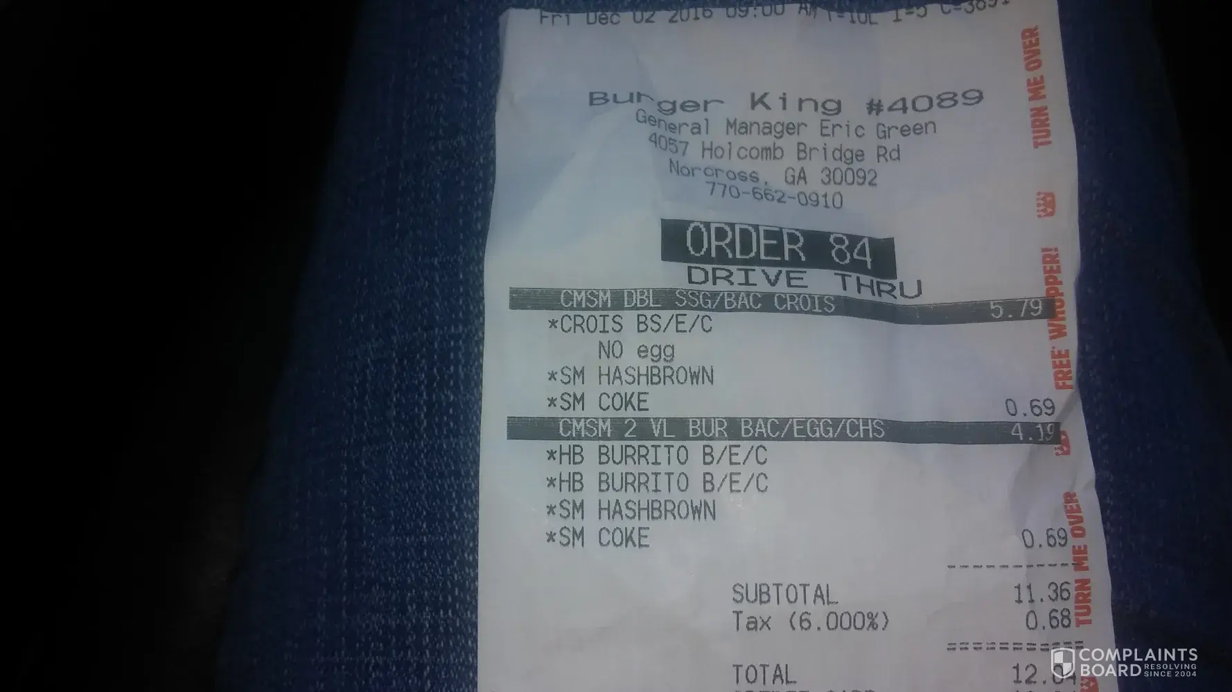 Today at 2:11 pm on 11/13/2016 i ordered a bacon cheese burger from burger king at bridge st Lowell.