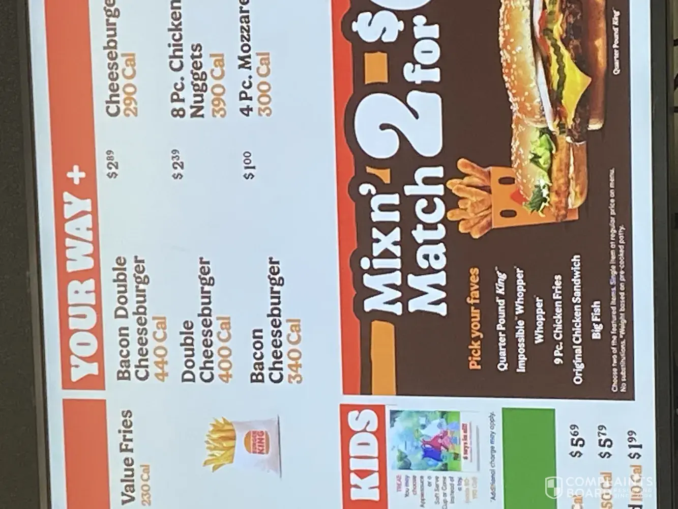 On your window it says Mix and Match 2 for $6 and they charged 2 for $7. When we told them that said the burgers come in different sizes? When does a regular Whopper come in different sizes? Then they said that's what the computer charges and was rude to us for calling them out trying to rip us off