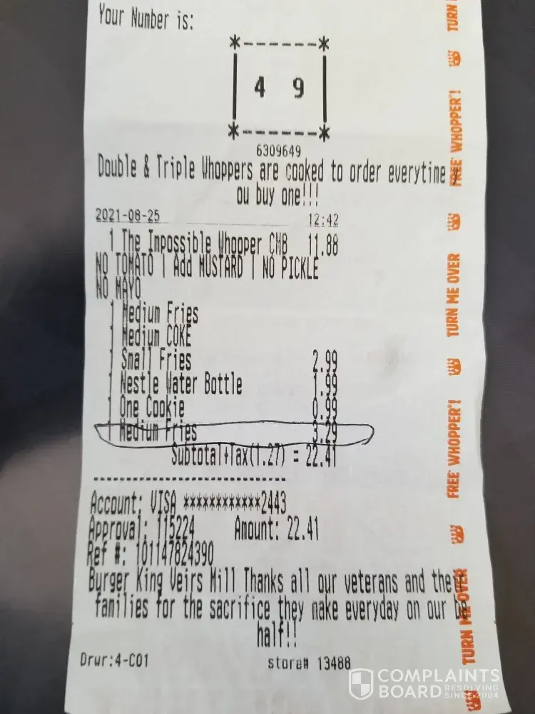 I demand refund of $3.29. I will think twice going to Burger King, where service is getting to be shoddy at best.