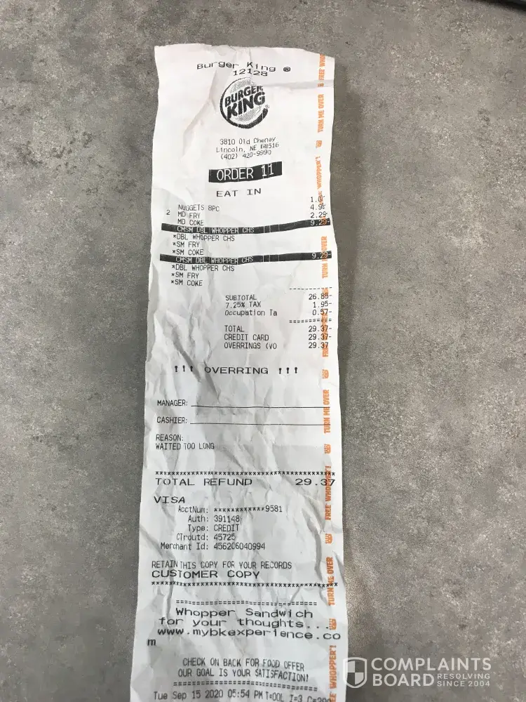 ordered 2 whopper meals for 8.99 with coupon also ordered mozarella sticks for 2.99 and never recieved them this was on 9/9 about 4;15 at burger king 13053