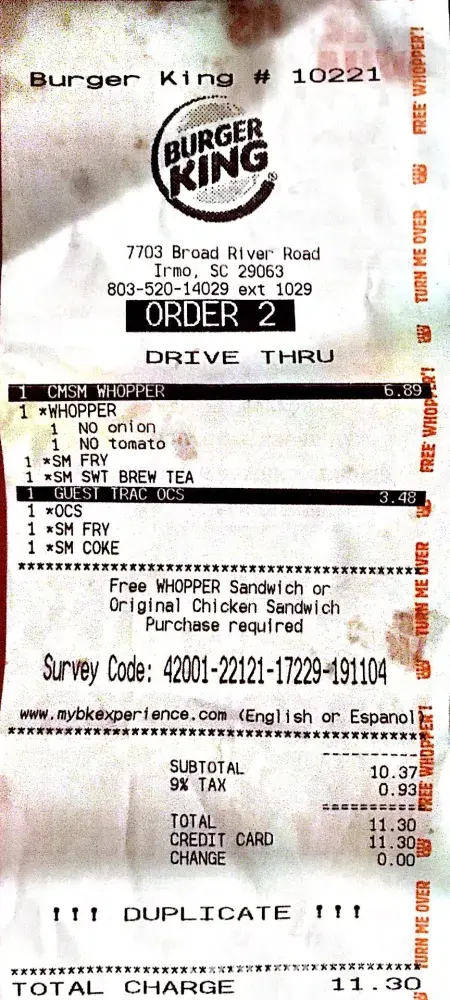 Store 9806- Little River Sc (843)280-5077 order 275 I recently visited this location on December 13th at 3:29 pm. I ordered two double whopper combos as i usually do and as usual one of them were wrong. Im not one to complain but it hapns alot and im tired of paying around $8 for wrong food . This is a friday treat for me and my son on a weekly basis but we...