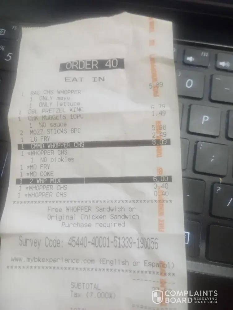 I recently visited one of your establishments on 10/31/2019 and had a pleasant interaction at the register. However that would all change once I arrived at home. I was planning on doing the survey on the reciept but when I got home the reciept was missing all of the information except for the Survey Code. Now I can't do the survey. If your stores could print the correct information on the reciepts so that others won'thave to go through this. So in the end I can't do the survey, which means no free Whopper.