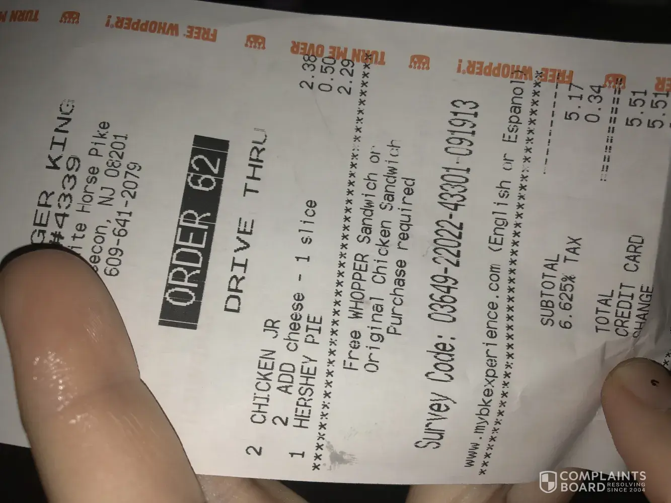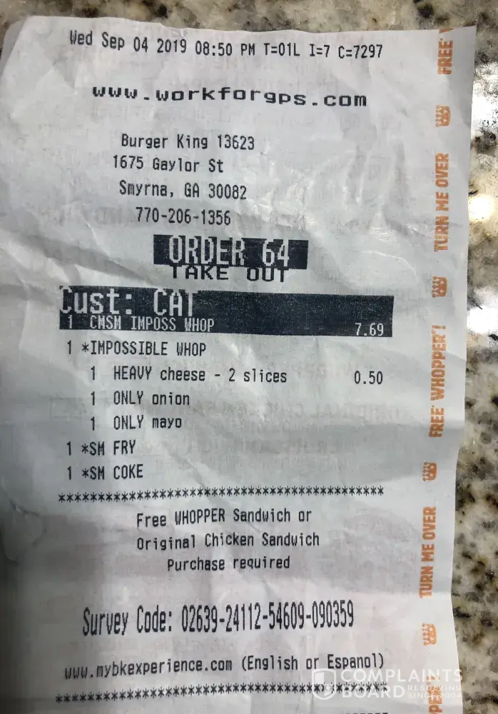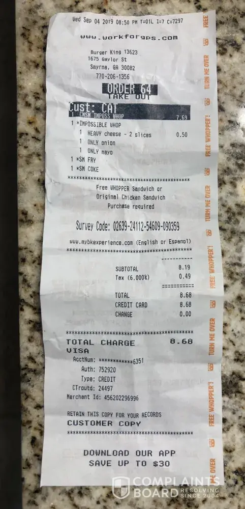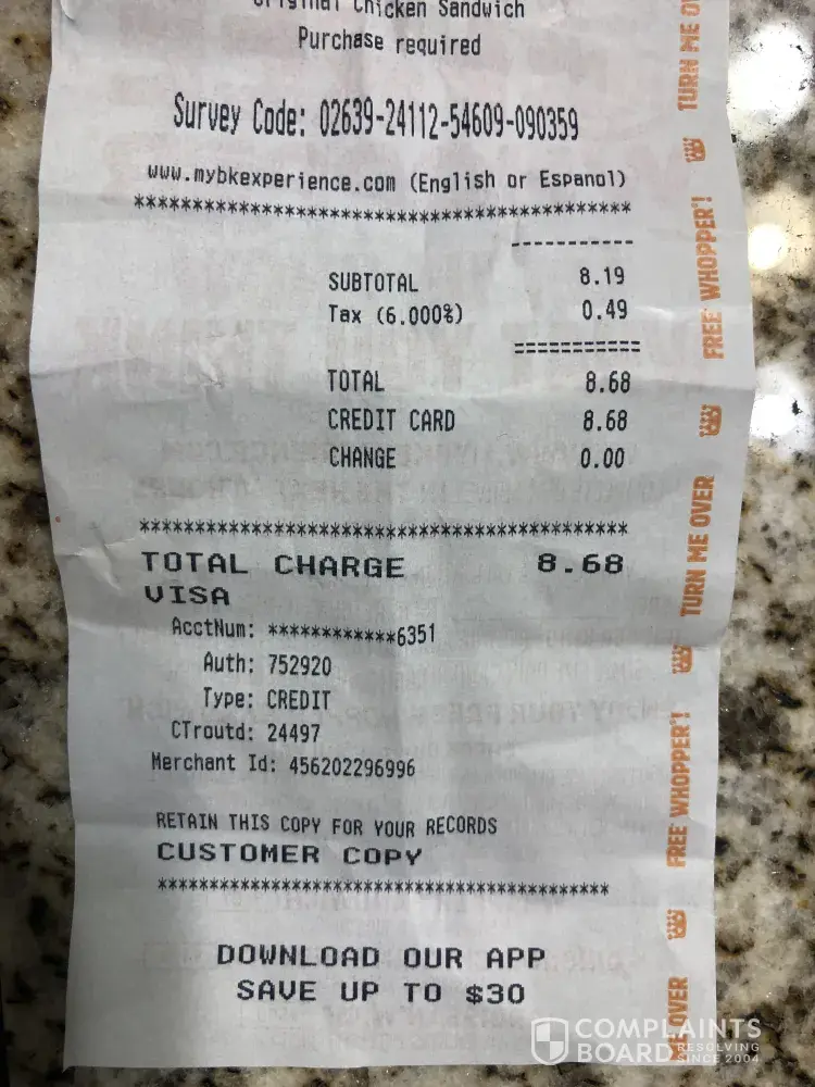On 08/31/2019 at 6:28PM I purchased for the first time the BK IMPOSSIBLE Whopper burger meal (Large). I enjoyed and wanted to complete the the BK survey. However, when I got home noticed there was not survey code on the bottom of my receipt as shown on the example online at visit to the site: WWW.MYBKEXPERIENCE.COM. I am heart broken. I would like to compliment the great service I received.
