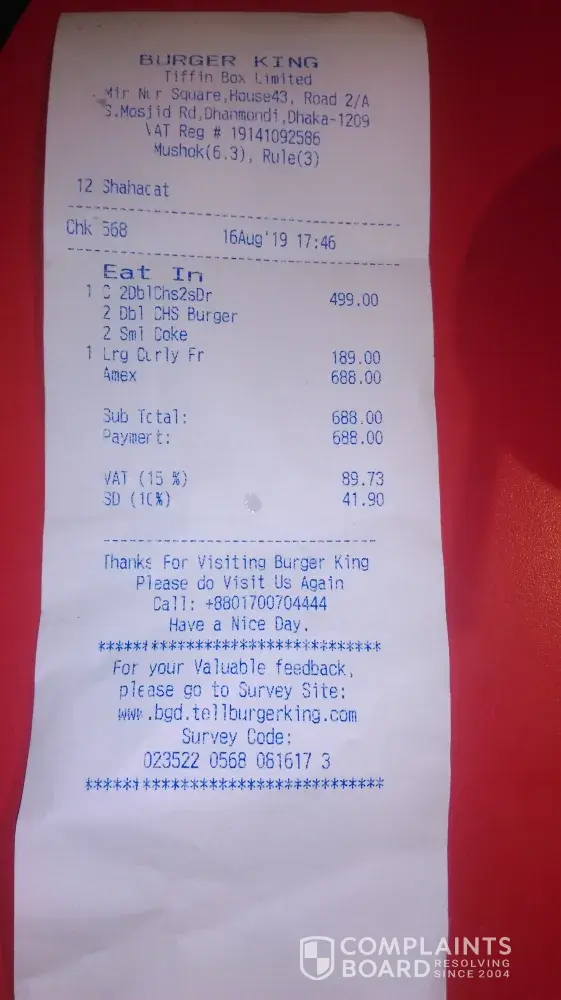 I am very confused about the quality food of the burger king . I am requiring to take action against the bad quality food of the burger king Dhaka, Bangladesh. I order the curry chips with the burger but the food was not good quality or not able to eat by human I believe. I'm attending the pic and receipt of the purchase. I'm a teacher of a university. Please contact me in case [protected]@uap-be.edu