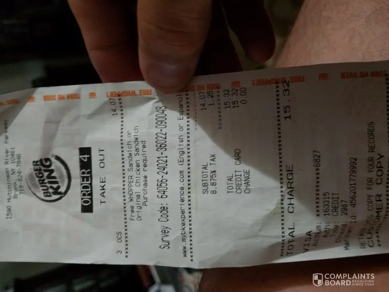 Went to burger king /070/3/19 around 10:15pm ordered original chicken sandwhich meal with pickles. Double whopper meal 10 pc nugget and spicy chicken sandwhich..20.00 and change. Didnt get receipt after taken money was told no fries; onion rings or tots..oinion rings and original chicken waa old and redropped in grease...without having receipt i waa very diappointed and felt wouldve been waste of time to ride all the way back...not to mention didnt get drinks