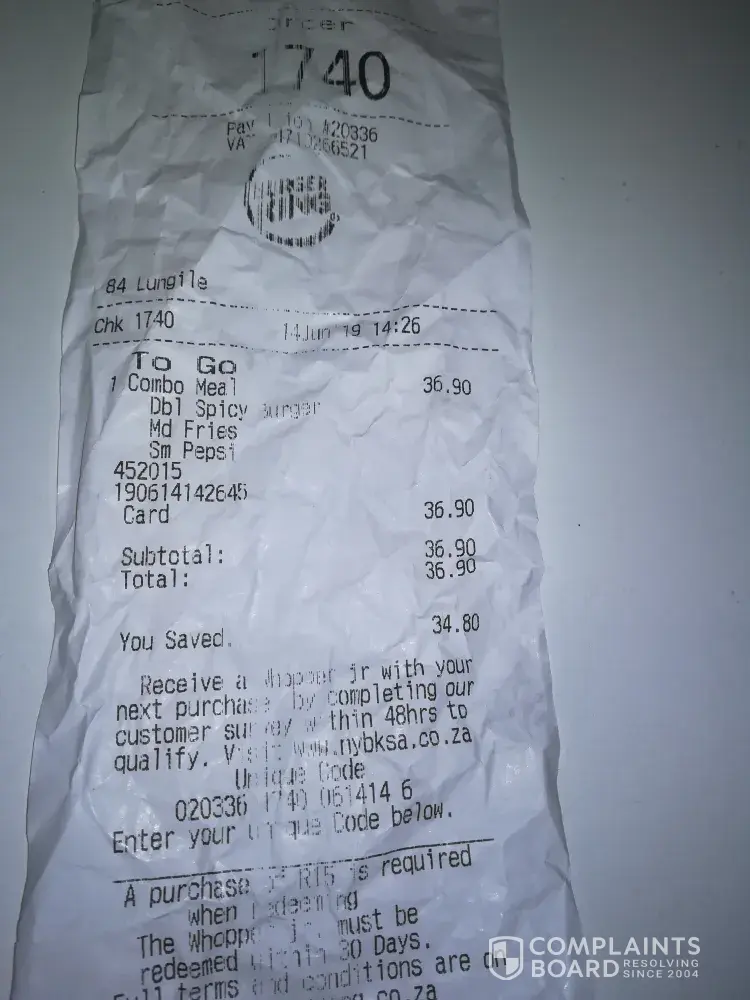 Am so disappointed on my burger I perched in burger King Pavillion the burger was burnt it was a horrible meal and because it was so busy and my lunch was almost done to return it I had to eat it was the worst meal ever. If they can advise managers to check on the food they giving us. It really unfair to pay for a meal like that.