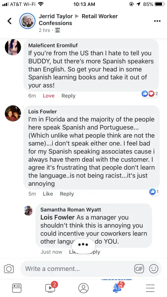 She's was saying that has to deal with costumers that does not speak English is annoying. I'm a Portuguese speaker also I learn Portuguese by living here. I thought this comment was very racist. I think as a manager she should not being on internet saying those things. Maybe as a manager and she knows that most of the costumer speaks Portuguese and Spanish she should learn the language to give a better costumer service. This made me so upset that I really want to know which store she works so I can guarantee that I don't buy anything from there.