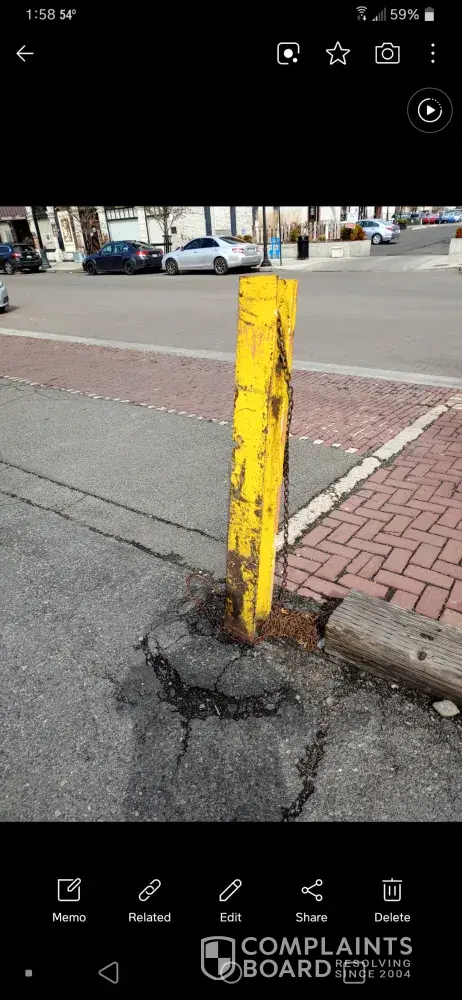 As I wasn't able to park in the street to attend a baby shower. @ 32 front Street. I backed into a empty space in my truck. Upon leaving as I didnt see due to odd location. Rubbed against something n stopped when I noticed a piece off RR track used as a saftey pole? Or chain? I don't see how its safe or legal. Was minor damage few $100 damages to step bar and pretty nasty scratched. Please let me know. I am agrivated as I dnt know what to do. I was parked in the space directly next to object. I took these pictures and sent a complaint to city of yakima. Said property was yours.