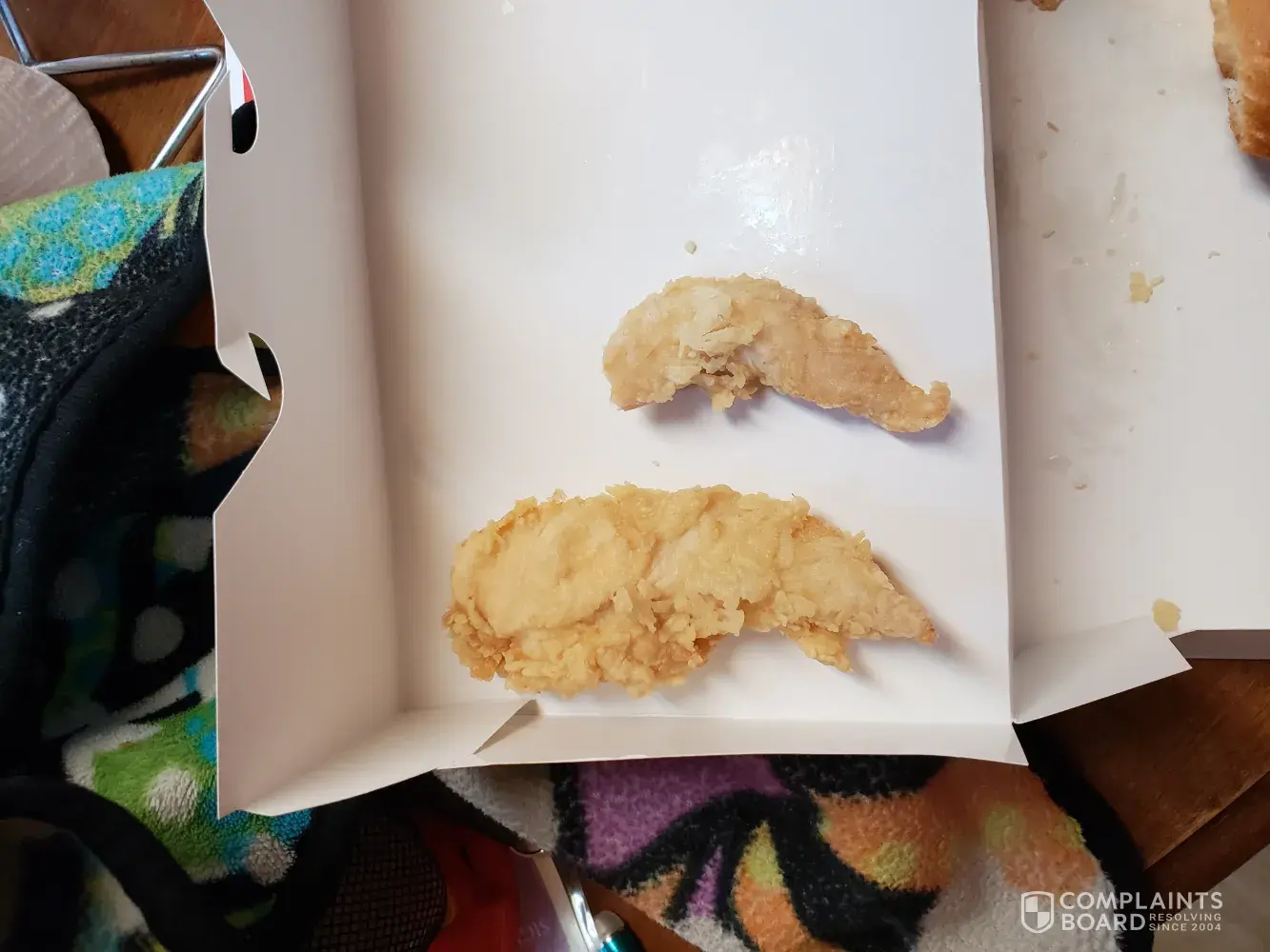 I ordered two 4-Piece tender meals, one with mashed potatoes the other one with fries with of course two large sweet teas. I get home and I open one of the boxes to start eating I have two pieces of tenders that are half the size of what it's supposed to be. Like these actually look like chicken nuggets. Now when I paid for my food which came out to like...