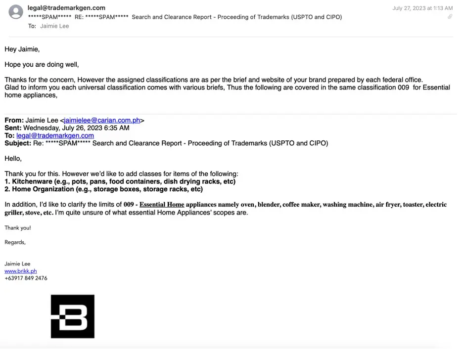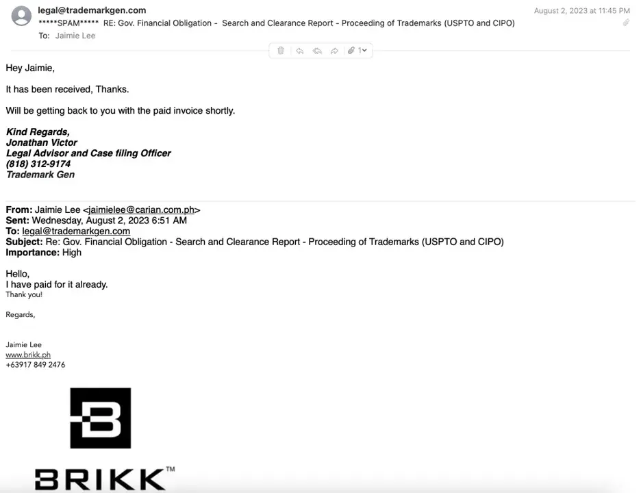 Last July, we were referred to Trademark Gen for the processing of our trademark. We were informed that they had different packages available, where we would pay a $350 service fee, and a $525 government fee per trademark class to the USPTO, which they will process for us on our behalf. After the exchange of documents and details, Trademark Gen (Jonathan...